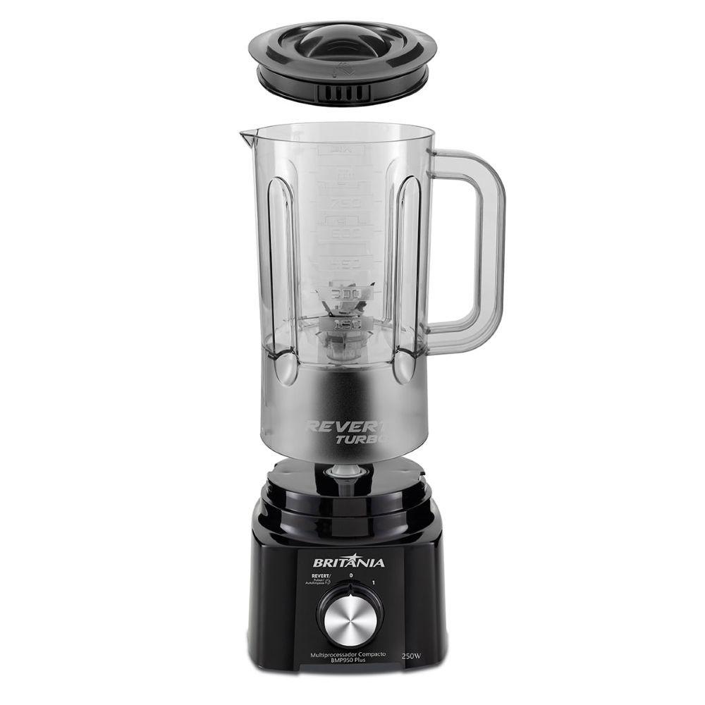Multiprocessador Compacto Bmp950 Plus 300W Britânia 110VCódigo do Fornecedor: 31201006Marca: BritâniaConteúdo da embalagem: 1 Multiprocessador Compacto BMP950 Plus 300W Britânia 2 em 1 Com Jarra e Copo Liquidificador 110VMultiprocessador Compacto Britânia BMP950 Plus: Sua cozinha completa em um só aparelho!Prepare deliciosas receitas com praticidade e rapidez com o Multiprocessador Compacto Britânia BMP950 Plus. Desfrute de um eletrodoméstico 2 em 1, versátil e fácil de usar que te ajuda a criar pratos saborosos e nutritivos para toda a família.Conheça seus benefícios:Multifuncional: Processa, corta, mistura, pica, moe e liquidifica.Potente: Motor de 250W com alto desempenho para triturar os alimentos com mais rapidez e eficiência.Função Revert: Rotação em dois sentidos para melhores resultados em diferentes receitas.Tecnologia Maxx 6: Seis lâminas de altíssimo poder de trituração para garantir resultados perfeitos.Compacto e funcional: Design moderno e que ocupa pouco espaço na cozinha.Fácil de usar: Controle simples com 1 velocidade + pulsar + autolimpeza.Prático de limpar: Todos os acessórios podem ser lavados na lava-louças.: Trava de para ambos os copos e base antiderrapante.O Multiprocessador Compacto Britânia BMP950 Plus é perfeito para quem busca:Praticidade e economia de tempo na cozinha.Alimentos mais saudáveis e saborosos.Um produto durável, versátil e de alta qualidade.Invista em sua cozinha e experimente a diferençaEspecificações:Potência: 250WVoltagem: 110VMaterial do copo do liquidificador: PlásticoMaterial da jarra do processador: PlásticoCapacidade da jarra do processador: 500mlCapacidade do copo do liquidificador: 850mlDimensões: 22 x 22 x 37 cmPeso: 2,1 kgGarantia: 12 meses NA