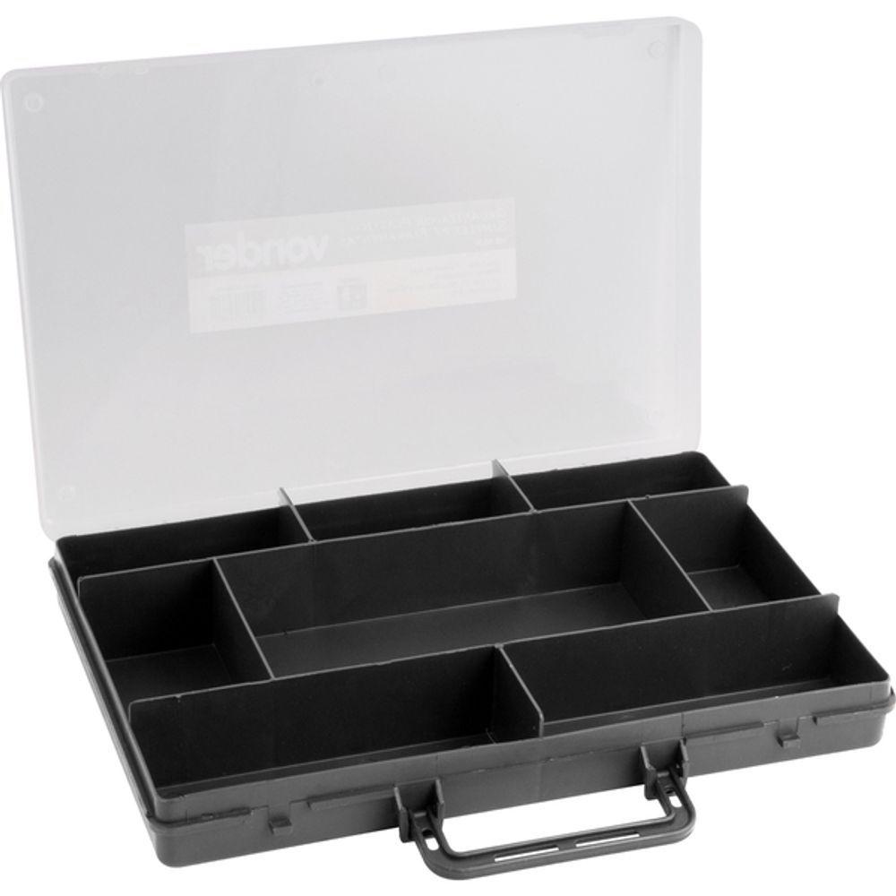 Organizador Plástico 32,5x22x5cm 8 Div Fixas Vd8020 VonderConteúdo da embalagem1 Organizador para ferramentasAplicações e dicas de usoIndicado para organizar e armazenar ferramentas, peças e acessórios em geralDestaques e diferenciaisPossui 1 alça e 8 divisórias fixasDETALHES TÉCNICOS Comprimento do organizador para ferramentas 325,0 mm Largura do organizador para ferramentas: 220,0 mm Altura do organizador para ferramentas: 50,0 mm Material do organizador para ferramentas: Polipropileno Cor do organizador para ferramentas: Preto e transparente Capacidade de carga: 2 kg Produto: Organizador | Tipo de organizador: Fixas | Material: Plástico
