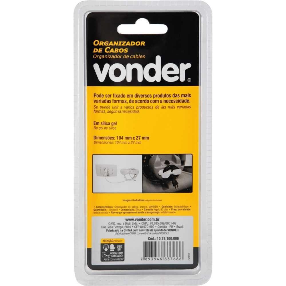 Organizador De Cabos Branco VonderOrganizador de Cabos Branco VonderQualificação TécnicaMaterial (tipo/composição): Sílica gel Dimensões: 104 mm x 27 mm Massa aproximada (peso) (kg): 0,029 kgCod. Fornecedor: 1078100000Marca: VonderConteúdo da embalagem: 1 Organizador de cabosDestaques e diferenciais: Produto com ótimo acabamento, dando proteção aos cabos e fios elétricos, além de garantir organização ao ambiente. Devido a sua flexibilidade, pode ser fixado em superfícies planas ou curvas, de acordo com a necessidade.Garantia legal: 3 meses Aplicações e dicas de uso:Indicado para proteger e organizar cabos e fios elétricos de diversos equipamentos da casa, escritório, entre outros. NA