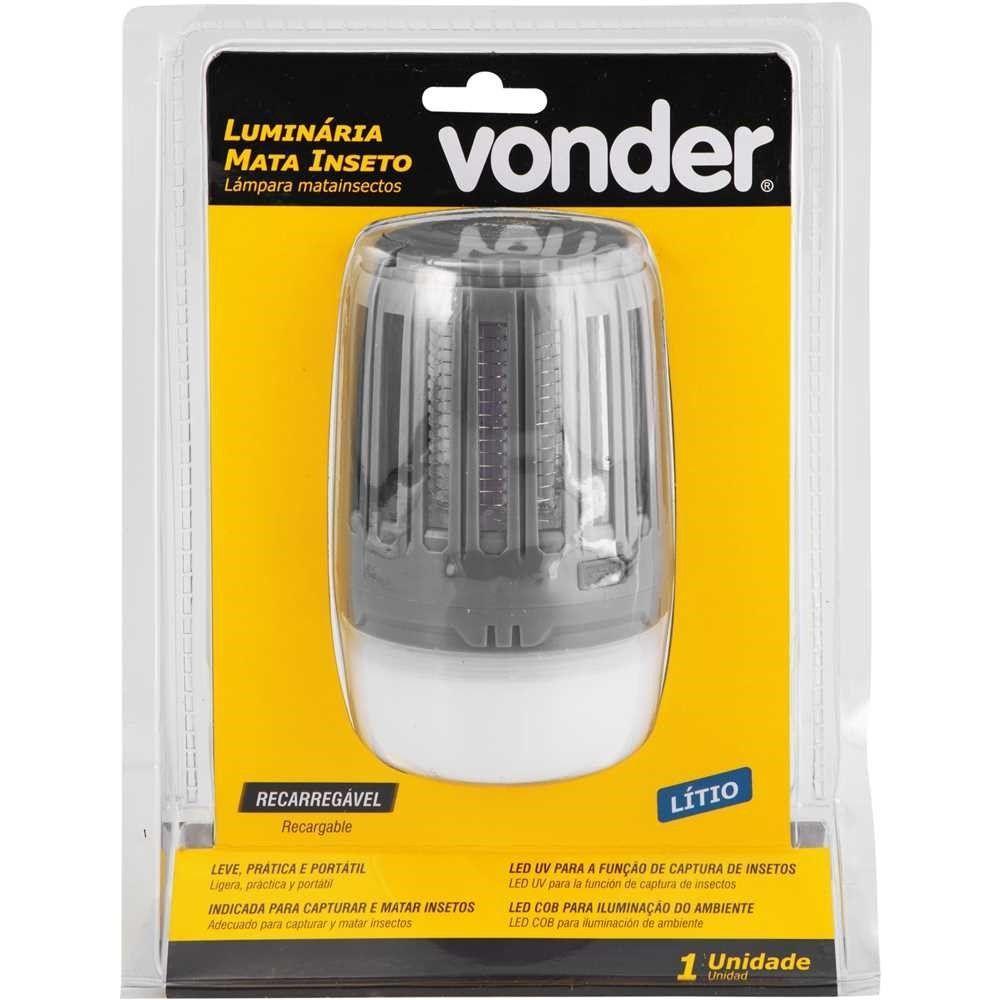 Luminária Mata Inseto Recarregável VonderConteúdo da Embalagem: 1 Luminária mata inseto, acompanha: 1 cabo USB para carregamento.Leve, prática e portátil, é fabricada com tecnologia inovadora, além de possuir design compacto e moderno. Luminária com LED COB com 2 modos (forte e fraco) e bateria recarregável de Íons de Lítio, proporcionando maior durabilidade. Livre de produtos químicos.Indicada para capturar e matar insetos. Possui LED UV para a função de captura de insetos e também LED COB, para iluminação do ambiente. Ideal para proteger ambientes internos.Garantia legal: 90 diasMaterial: Plástico ABSTipo do LED: Luminária: LED COB; Mata mosquito: LED SMD UVTensão da bateria: 3,7 VTipo de bateria: Íons de lítioFluxo luminoso (lm): 200 lmTensão de entrada: 5 V DC / 1 ADimensões: 85 mm x 135 mmMassa aproximada (peso): 0,215 kg Produto: Luminária