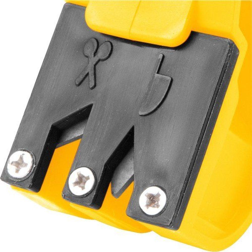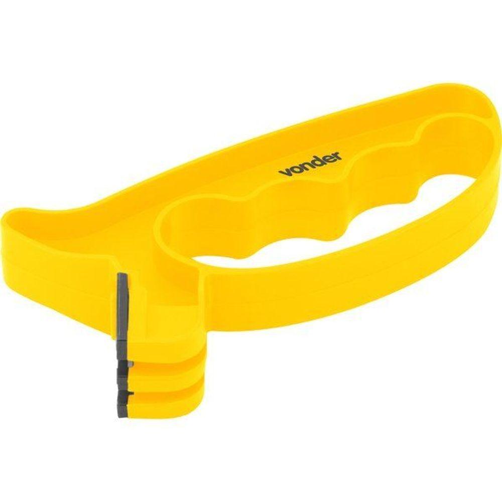 Afiador De Facas/tesouras Com Vídea VonderAplicações e dicas de usoAfiador 2 em 1, pois possui 2 pastilhas de metal duro (vídea) sobrepostas em formato V para afiar facas e 1 pastilha de metal duro (vídea) em ângulo para afiar tesouras, proporcionando praticidade e rapidez na operação e perfeito acabamentoIndicado para conexão rápida em redes de ar comprimidoIndicado para afiar facas e tesourasCaracterísticas TécnicasMaterial do corpo do afiador: Plástico Material da superfície de afiação: Metal duro/Vídea Aplicação: Facas e tesouras Produto: Afiador