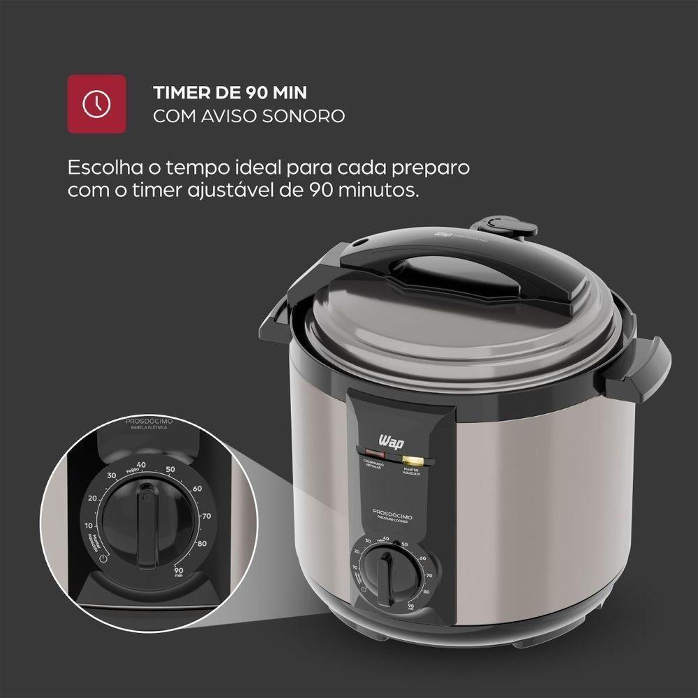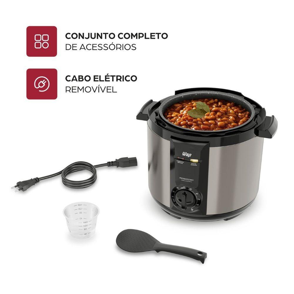 Panela Pressão Elétrica 900W 5l Antiaderente WAP Wppe2 220VCódigo do Fornecedor: FW010157Marca: WAPConteúdo da embalagem: 1 Panela de Pressão Elétrica 5L Inox Antiaderente GrayStone 900W 220V WPPE2 WAPDADOS TÉCNICOS:Tensão: 220VPressão de trabalho: 70 kPaPotência: 900WFrequência: 60 HzCapacidade: 5 LPainel: Analógico/MecânicoFunção Manter Aquecido: SimTimer: 0-90 minAviso sonoro: SimAviso sonoro: SimTrava de : SimLuz indicadora de funcionamento: SimRevestimento antiaderente: Sim - GrayStonePés antiderrapantes: SimTipo de tomada: 10AComprimento do cabo elétrico: 1 mCor: Inox e PretoMaterial: Polímeros e MetaisGarantia: 2 anosACESSÓRIOS:1x Colher plastica1x Copo medidor1x Cabo elétrico1x Cesto removível1x Coletor VaporDIMENSÕES:Dimensões do Produto Montado C x L x A: 33,5 x 34 x 32 cmPeso Líquido Produto: 4 kgMais segura e eficiente comparada às opções tradicionais, equipada com nove dispositivos de , os sensores, válvulas, travas automáticas e manuais visíveis, oferecem controle total durante todo o processo de cozimento.Com o timer de 90 minutos e aviso sonoro, a panela de pressão elétrica WAP permite criar uma variedade de pratos, ajustando o tempo de preparo de forma precisa para cada receita.Ao selecionar a ?Função Feijão?, a cocção dos grãos é feita em menos tempo do que os métodos tradicionais, sem nunca perder o sabor. E, ao final do preparo, o desligamento automático ativa a Função Manter Aquecido. Ela garante que os pratos permaneçam na temperatura ideal até a hora de servir.A capacidade interna de 5 litros é perfeita para preparar porções para a família toda. Seu recipiente interno removível é revestido com dupla camada antiaderente Gray Stone, o que evita que o alimento grude no fundo da panela, facilitando a limpeza. Sistema de cozedura: A pressão | Tipo de Panela: Panela de Pressão | Cor: Cinza | Voltagem: 220V