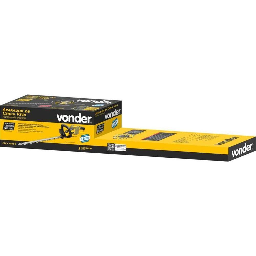 Aparador De Cerca 36v Intercamb S/ Baterias Iacv1845b VonderCod. Fornecedor: 6004184500Marca: VonderConteúdo da embalagem: 1 Aparador de cerca viva.Destaques e diferenciais: Este equipamento utiliza um modelo de bateria que pode ser intercambiável (não acompanha), ou seja, uma bateria que é com outros modelos de ferramentas a bateria VONDER. Por isso, em sua próxima compra de ferramenta a bateria VONDER, procure um modelo que comece com a referência I, ou que esteja identificado com o selo Bateria Intercambiável VONDER. Desta forma, você garante modelos mais econômicos, sem a necessidade de aquisição de novas baterias e carregadores para uso em seu equipamento. Robusto, potente e eficiente, possui punho emborrachado com formato ergonômico e com sistema rotativo em 180° (5 posições), proporcionando maior conforto na operação. Conta ainda com duplo sistema de acionamento, proporcionando maior ao operador. Além de motor Brushless (sem escova de carvão), que garante maior durabilidade, resistência e desempenho.Não acompanha bateria e carregador.Garantia legal: 1 anoQualificação TécnicaCapacidade de corte: Ø 26 mmComprimento efetivo da lâmina: 510 mmRotação (rpm): Dimensões: mm x 200 mm x 200 mmAceleração transmitida nas mãos - braços do operador - ah: 4,08 m/s²Incerteza da aceleração transmitida nas mãos - braços do operador - k: 1,5 m/s²Massa aproximada (peso) (kg): 2,8 kg Tipos de máquinas: Aparador de grama | Voltagem: 36V