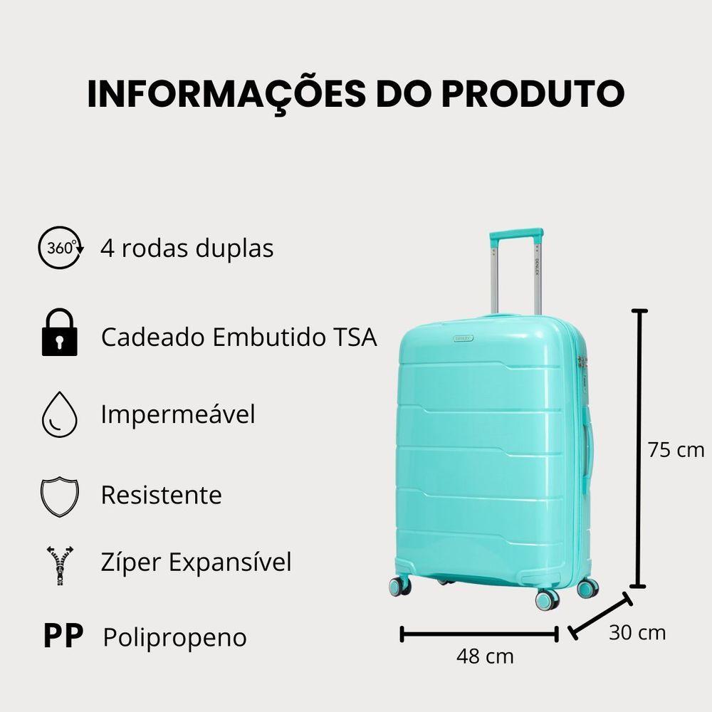Mala Grande 32kg Viagem Zíper Expansível Em Polipropileno Rodinhas 360º Tsa - Lima - Denlex Cor Azul TurquesaMarca: DenlexModelo: LimaMaterial: Polipropileno inquebrável resistente à impactos e riscosTamanho: Mala de 32kgZíper expansível: SimIndicação: Ideal para despachar em viagens de avião, ideal para viagens de carro, trem, ônibus e metrôCarrinho puxador: Embutido em alumínio antiferrugem com regulagens de alturaRodinhas: 4 rodas duplas com giro 360º para maior conforto no manuseioTipo de rodinhas: FixasCadeado: Embutido com segredo numérico de 3 dígitos para maior segurança TsaAlça: Superior e lateral para maior conforto ao carregarFecho: Zíper duplo para maior praticidade e segurançaImpermeável: SimOrganização interna: Divisória e cinta elástica fixadoraBolso interno: Contém bolso interno na divisória da malaForro interno: Completamente forrada com poliéster resistentePés de apoio laterais: SimPossui TSA: SimEspecificações da mala (medidas dentro do padrão de despacho 158cm lineares)Medidas com expansor fechado: 75cm x 48cm x 30cm - contando as rodas e alça (padrão de despacho)Medidas com expansor aberto: 75cm x 48cm x 34cm - contando as rodas e alça (padrão de despacho)Capacidade em volume: 100 litros (expansor fechado) - 114 litros (expansor aberto)Peso: 3,9kgDiâmetro das rodinhas: 5 cmFabricada em polipropileno resistente, a mala garante durabilidade e proteção contra impactos.As rodinhas duplas 360º da mala proporcionam mobilidade suave e confortável, facilitando o deslocamento em qualquer superfície.O cadeado Tsa embutido oferece segurança reforçada para seus pertences.A mala é ideal para quem busca leveza, organização e resistência em um só produto.Principais benefícios desse modelo: Capacidade para 32kg e divisória interna Material em polipropileno resistente e leve Rodinhas duplas giratórias 360º para máxima mobilidade Cadeado embutido Tsa para proteção dos seus itensPerguntas Frequentes – Mala de Viagem 32kg (Grande / Despachável)1. Essa mala é aceita como bagagem despachada nas companhias aéreas?Sim. A mala segue os padrões recomendados pelas companhias aéreas e é aceita como bagagem despachada em voos nacionais e internacionais. A mala mesmo com o zíper expansível aberto está dentro do limite de despacho de 158cm lineares.2. Qual é o peso máximo permitido dentro da mala?O peso permitido varia conforme a companhia aérea, mas para malas grandes o limite costuma ser de até 32kg para despacho.3. Qual o material da mala?A mala é produzida em polipropileno de alta resistência, material leve, durável e ideal para suportar impactos e manuseio intenso durante viagens longas.4. A mala tem cadeado?Sim. Possui cadeado embutido com segredo numérico Tsa, oferecendo mais segurança aos seus pertences.5. As rodinhas giram 360°?Sim. As rodinhas são multidirecionais 360°, permitindo movimentação suave, prática e confortável, mesmo com a mala carregada.6. A alça é resistente?Sim. Conta com alça telescópica em alumínio reforçado, além de alça superior e lateral fixa, garantindo resistência e facilidade no transporte.7. Qual a capacidade da mala em litros?A capacidade média é de aproximadamente 100 a 114 litros, ideal para viagens mais longas ou para quem precisa levar muitos itens.8. Essa mala risca fácil?Não. O polipropileno possui acabamento que ajuda a minimizar riscos e arranhões, mesmo com o uso frequente em aeroportos.9. Tem garantia?Sim. Todas as malas possuem garantia de fábrica, assegurando qualidade, durabilidade e tranquilidade ao cliente.10. Qual o prazo de postagem?O prazo de postagem é de no máximo 1 dia útil, podendo ser enviada no mesmo dia da compra.11. A embalagem é resistente?Sim. Todas as malas são enviadas em caixas reforçadas, garantindo que cheguem ao cliente protegidas e em perfeito estado.