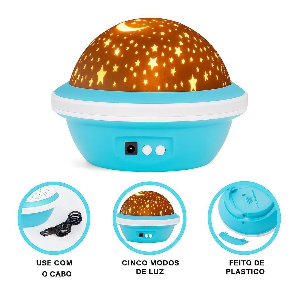 Luminaria Ceu Estrelado Abajur Quarto Cabiceira Noturna Protejor De Teto Estrela Lua Infantil Adulto Bebe AzulLuminária Estrelada Infantil com USB e PilhasTransforme o quarto das crianças em um universo encantado com a Luminária Estrelada Infantil. Ideal para iluminar o ambiente noturno ou dar um toque especial em festas e decorações, esta luminária projeta belas estrelas no teto e nas paredes, criando um ambiente mágico e acolhedor.Perfeito para enfeitar um cômodo durante a noite, a Luminária Estrelada Infantil ilumina tanto a parede quanto o teto, proporcionando uma experiência visual fascinante.Versatilidade de Uso:Quando conectada via USB, a luminária pode se transformar em um abajur normal, removendo a tampa estelar para um uso mais prático e cotidiano.Modos de Iluminação e Cores Disponíveis:VermelhoVerdeAzulVermelho com azulVerde com azulVerde com vermelho3 cores juntasControles Fáceis de Usar:Botão A: Liga e desliga a luzBotão B: Alterna entre as opções de cores da projeção (4 principais cores + combinações de cores duplas e trio)Segurança e Durabilidade:Não esquenta, mesmo com o uso contínuo durante a noite toda, garantindo a segurança das crianças.Especificações:Tamanho: 10.7 x 13.9 centímetrosMaterial: ABSFonte de Energia: 4x Pilhas AAA (não inclusas) ou Cabo USB (incluso)Adicione um toque de magia e diversão ao quarto das crianças com a Luminária Estrelada Infantil, perfeita para criar um ambiente aconchegante e inspirador. Seja para um sono tranquilo ou para enfeitar festas, esta luminária é a escolha ideal para iluminar os momentos especiais.Luminária Estrelada Infantil com USB e PilhasTransforme o quarto das crianças em um universo encantado com a Luminária Estrelada Infantil. Ideal para iluminar o ambiente noturno ou dar um toque especial em festas e decorações, esta luminária projeta belas estrelas no teto e nas paredes, criando um ambiente mágico e acolhedor. Perfeito para enfeitar um cômodo durante a noite, a Luminária Estrelada Infantil ilumina tanto a parede quanto o teto, proporcionando uma experiência visual fascinante.Versatilidade de Uso:Quando conectada via USB, a luminária pode se transformar em um abajur normal, removendo a tampa estelar para um uso mais prático e cotidiano.Modos de Iluminação e Cores Disponíveis:VermelhoVerdeAzulVermelho com azulVerde com azulVerde com vermelho3 cores juntasControles Fáceis de Usar:Botão A: Liga e desliga a luzBotão B: Alterna entre as opções de cores da projeção (4 principais cores + combinações de cores duplas e trio) Segurança e Durabilidade:Não esquenta, mesmo com o uso contínuo durante a noite toda, garantindo a segurança das crianças. Especificações:Tamanho: 10.7 x 13.9 centímetrosMaterial: ABSFonte de Energia: 4x Pilhas AAA (não inclusas) ou Cabo USB (incluso) Adicione um toque de magia e diversão ao quarto das crianças com a Luminária Estrelada Infantil, perfeita para criar um ambiente aconchegante e inspirador. Seja para um sono tranquilo ou para enfeitar festas, esta luminária é a escolha ideal para iluminar os momentos especiais.