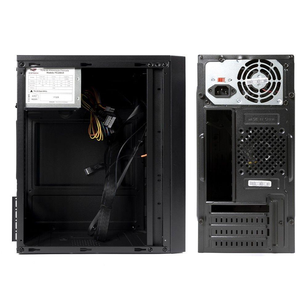 Gabinete Atx C3tech Mt-31bk C/ Fonte 200w S/ CaboEspecificações:- Gabinete Torre Micro ATX- Fonte 200Watts Inclusa- Tamanho 2 Baias- Suporta placas mãe Micro ATX- Suporte a SSD 2,5- 2 portas USB frontais- Entrada para microfone e saída para fone de ouvido (Padrão P2 3,5mm)- Áudio AC97- Organizador de Cabos- Tintura externa e interna antiestática e anticorrosiva- Espessura da chapa: 0,35mm SPCC- Tintura externa e interna antiestática e anticorrosiva- Quantidade de baias 3,5: 1 Internas- Quantidade de baias 2,5 e SSD: 2 Internas- 4 slots PCI- Ventilação Frontal: com Cooler Fan 12cm (não acompanha cooler)- Ventilação Traseira: com Cooler Fan 8cm (não acompanha cooler)- Ventilação Lateral: com Cooler Fan 12cm (não acompanha cooler)- com placa de vídeo até 20cm- com CPU Cooler até 14cm*Obs: Imagens meramente ilustrativas.