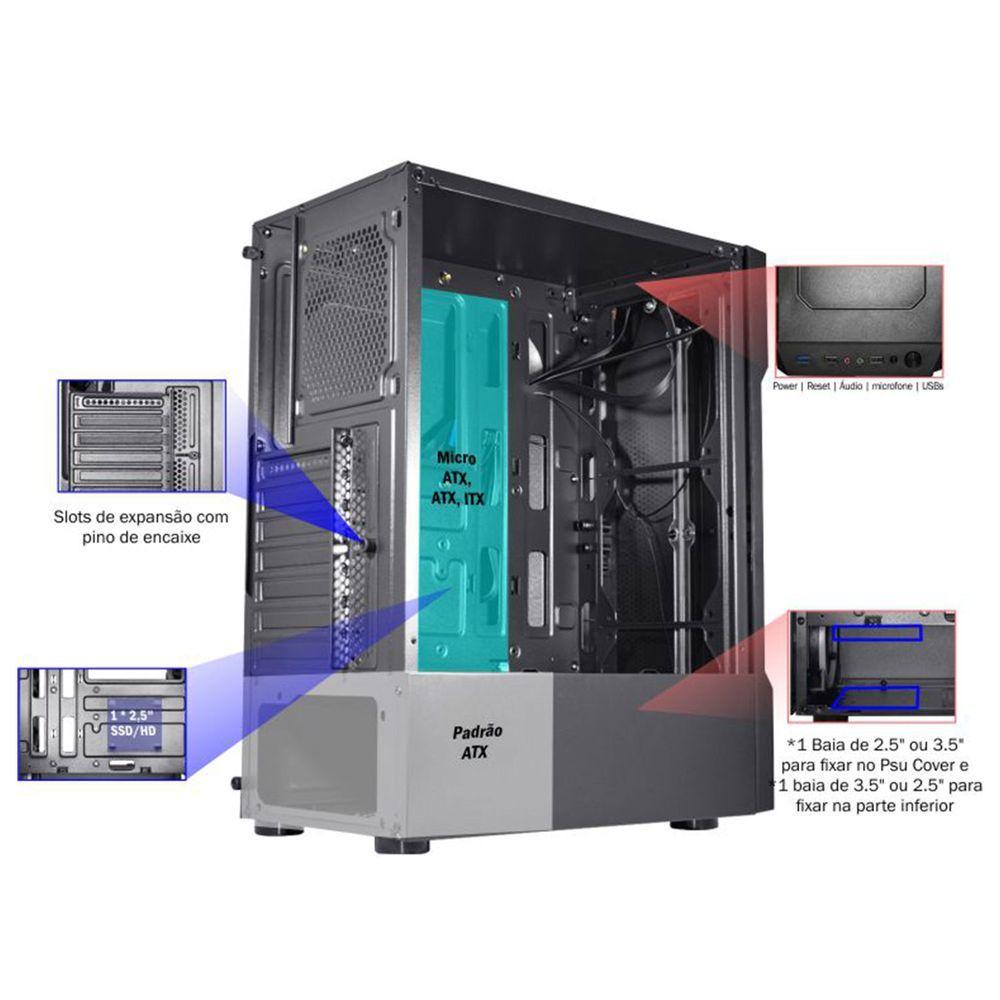 Gabinete Gamer K-mex Demon Ii, Lateral Em Vidro Temperado, Painel Led Argb, Atx - Cg-06w5DESCRIÇÃO GERAL:O Gabinete Gamer K-MEX DEMON II - CG-06W5 é projetado para entusiastas de jogos que buscam um design moderno e funcionalidade aprimorada. Com suporte para placas-mãe ATX, Micro ATX e ITX, oferece compatibilidade com uma ampla de componentes. Seu painel lateral em vidro temperado de 3 mm e a fita ARGB integrada proporcionam um visual atraente e personalizável. ;CARACTERÍSTICAS:MARCA: K-MEXMODELO: CG-06W5P/N: CG06W5RH001CB0XCOR: PRETOESPECIFICAÇÕES TÉCNICAS:Compatibilidade da Placa-mãe: ATX, Micro ATX, ITXDimensões do Chassi (A x L x P): 405 mm x 180 mm x 310 mmDimensões do Gabinete (A x L x P): 422 mm x 185 mm x 350 mmAltura Máxima para Cooler de CPU: 160 mmComprimento Máximo para Placa de Vídeo: Até 280 mmCompatibilidade com Fonte de Alimentação: Padrão ATXPortas USB: 3 x USB (A cor azul neste modelo não representa ; todas as entradas são Áudio: AC97Baias Internas:1x 2,5? SSD1x 2,5 ou 3,51x 2,5 ou 3,5 HDSlots de Expansão: 7Espessura do Chassi: 0,4 mmSistema de Refrigeração:Frontal: Suporta até 3 fans de 120 x 120 mm (opcionais)Traseira: Suporta 1 fan de 120 x 120 mm (opcional)Interna: Suporta 2 fans de 120 x 120 mm (opcionais)Compatibilidade com Water Cooler: ;Suporta radiador de 120 mm na parte traseira (fans opcionais não acompanham o produto e devem ser adquiridos separadamente)INFORMAÇÕES ADICIONAIS:PSU Cover: Incluso, para melhor organização dos cabosPainel com Fita ARGB: As barras de LED do painel são conectadas na placa-mãe através dos cabos indicados Power Led +/ Power Led - ;Painel Lateral: Vidro temperado de 3 mmBotões: Power e ResetConteúdo da Embalagem:1x Gabinete Gamer K-MEX DEMON II - CG-06W5