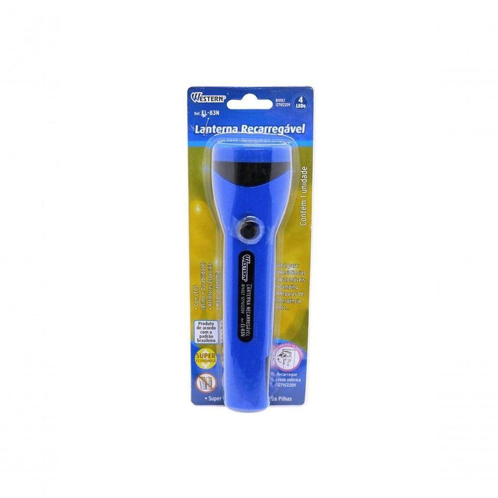 Lanterna Recarregavel Western Color 4 LedsDescricao Uma lanterna para facilitar tanto seus momentos de aventurar quanto em emergencias. Sendo recarregavel. Essa lanterna oferece a melhor qualidade para os momentos de camping, pescaria, caminhada, ciclistmo, resparos, entre outros. Oferecemos ferramentas de qualidade que nao podem faltar para voce! - Observacao Este item e comercializado em cores sortidas: Azul, Laranja, Amerelo e Verde. O Mix de cor e variavel e na entrega voce pode receber 1,2,3 ou 4 cores. - Caracteristicas Com LEDS (brilho e durabilidade). Lanterna carregavel (rede eletrica). Economica e nao utiliza pilhas. BIVOLT (127V/220V). Plug de acordo com o padrao brasileiro. Com refletores especiais que proporciona melhor iluminacao. Bateria carregavel 4V selada, de longa duracao, capacidade 300 mAh. Refletores Especiais Maior Autonomia Super Economica Nao utiliza pilhas Autonomia: aproximadamente 5 horas apos carga completa. A autonomina da lanterna e variavel dependendo da temperatura ambiente e de outros fatores como tempo de carga da bateria, quantidade de ciclos de carga da bateria etc... - Antes de usar pela primeira vez carregue completamente a bateria: Na primeira vez, a bateria de ser carregada completamente por 12 horas. Deixe o interruptor da lanterna na posicao DESLIGADO (OFF), escolha uma tomada longe de materiais inflamaveis e umidade. Coloque o plugue da lanterna na tomada (127V ou 220V). A luz piloto acendera, indicando que o plugue esta conectado corretamente e que a lanterna esta sendo carregada. Deixe carregando por 12 horas. O tempo de recarga nao deve exceder 15 HORAS. Recomendado carregar durante o dia. - Instrucoes Para ligar, empurre o interruptor de acendimento da lanterna para a posicao LIGADO (ON). Quando os LEDs da lanterna ficarem com a iluminacao fraca, interrompa o uso e carregue a bateria da lanterna. Recarregue antes da lanterna ficar completamente descarregada para nao danifica-la. - Carregar a bateria daDescricao Uma lanterna para facilitar tanto seus momentos de aventurar quanto em emergencias. Sendo recarregavel. Essa lanterna oferece a melhor qualidade para os momentos de camping, pescaria, caminhada, ciclistmo, resparos, entre outros. Oferecemos ferramentas de qualidade que nao podem faltar para voce! - Observacao Este item e comercializado em cores sortidas: Azul, Laranja, Amerelo e Verde. O Mix de cor e variavel e na entrega voce pode receber 1,2,3 ou 4 cores. - Caracteristicas Com LEDS (brilho e durabilidade). Lanterna carregavel (rede eletrica). Economica e nao utiliza pilhas. BIVOLT (127V/220V). Plug de acordo com o padrao brasileiro. Com refletores especiais que proporciona melhor iluminacao. Bateria carregavel 4V selada, de longa duracao, capacidade 300 mAh. Refletores Especiais Maior Autonomia Super Economica Nao utiliza pilhas Autonomia: aproximadamente 5 horas apos carga completa. A autonomina da lanterna e variavel dependendo da temperatura ambiente e de outros fatores como tempo de carga da bateria, quantidade de ciclos de carga da bateria etc... - Antes de usar pela primeira vez carregue completamente a bateria: Na primeira vez, a bateria de ser carregada completamente por 12 horas. Deixe o interruptor da lanterna na posicao DESLIGADO (OFF), escolha uma tomada longe de materiais inflamaveis e umidade. Coloque o plugue da lanterna na tomada (127V ou 220V). A luz piloto acendera, indicando que o plugue esta conectado corretamente e que a lanterna esta sendo carregada. Deixe carregando por 12 horas. O tempo de recarga nao deve exceder 15 HORAS. Recomendado carregar durante o dia. - Instrucoes Para ligar, empurre o interruptor de acendimento da lanterna para a posicao LIGADO (ON). Quando os LEDs da lanterna ficarem com a iluminacao fraca, interrompa o uso e carregue a bateria da lanterna. Recarregue antes da lanterna ficar completamente descarregada para nao danifica-la. - Carregar a bateria da