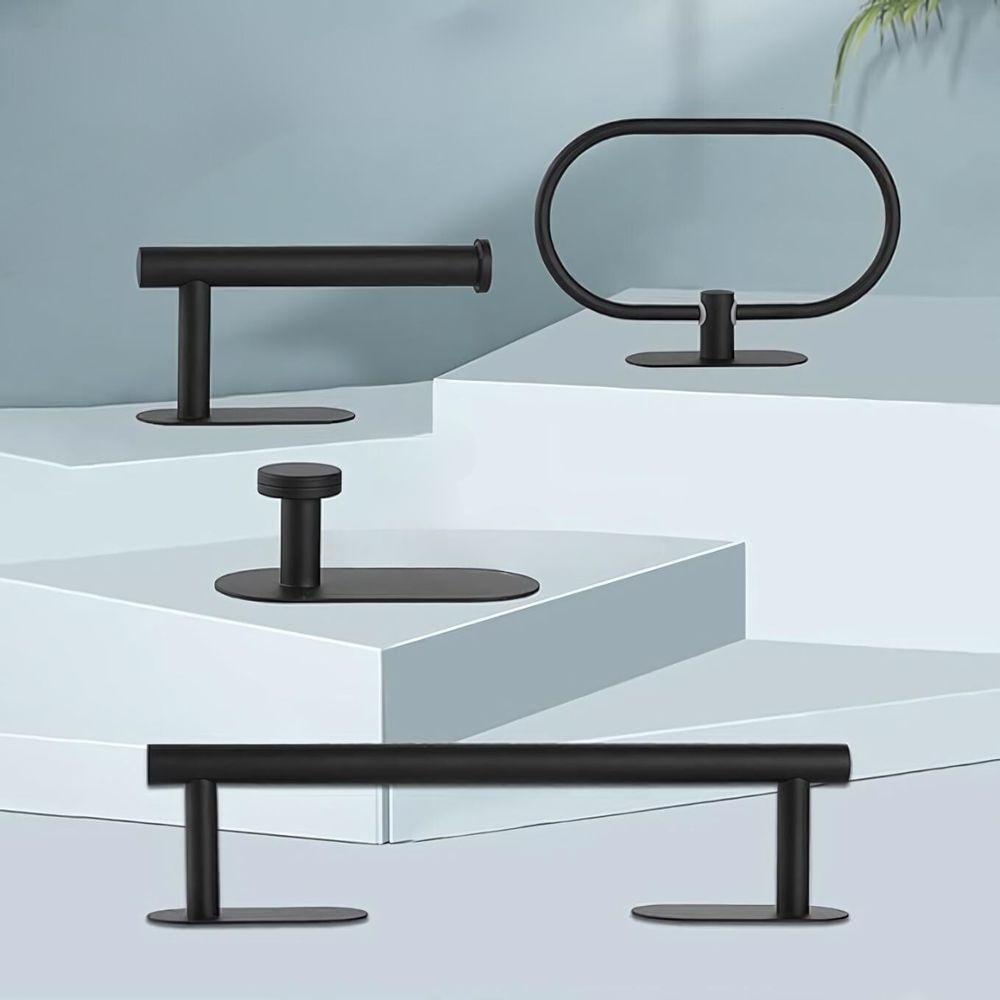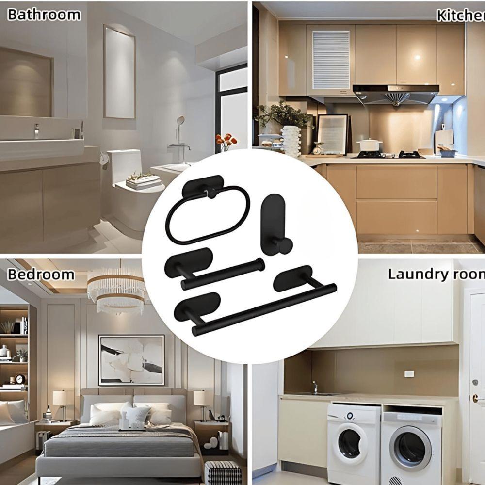 Kit Acessorios Banheiro Aço Inox Autoadesivo 4 Peças PretoKit com 4 acessórios de banheiro feito em inox, de alta qualidade. Ideal para tornar seu banheiro completo, elegante e organizado. Com nossos acessórios, a instalação é simples e não há necessidade de danificar a parede.Características:- Material Inox SUS304 - Resistente à corrosão- Durabilidade elevada- Instalação por adesivo 3M resistente até 6 kgs por peça, sem danificar a parede (aguardar 48 hrs para uso após instalação)Kit de 4 acessórios de inox de banheiroCaracterísticas:- Material Inox SUS304 - Resistente à corrosão- Durabilidade elevada- Instalação por adesivo 3M resistente até 6 kgs por peça, sem danificar a parede (aguardar 48 hrs para uso após instalação)Kit de 4 acessórios de inox de Banheiro:1. Porta toalhaComprimento: 39,6 cmAltura: 4,5 cmProfundidade: 8 cm2. Porta Papel higienicoComprimento: 16 cmAltura: 4,5 cmProfundidade: 8 cm3. Porta Toalha RedondoComprimento: 20 cmAltura: 4 cmProfundidade: 13 cm4. Acessório para pendurar roupaComprimento: 4,5 cmAltura: 10 cmProfundidade: 4 cmO kit inclui:Um espaçoso Porta-Toalha de Banho (39,6 cm de comprimento, 4,5 cm de altura, 8 cm de profundidade), ideal para suas toalhas maiores.Um prático Gancho (5 cm de comprimento, 10 cm de altura, 4 cm de profundidade), perfeito para pendurar roupões ou toalhas de mão.Um funcional Porta-Papel Higiênico (16 cm de comprimento, 4,5 cm de altura, 8 cm de profundidade), mantendo o rolo sempre ao alcance.Um elegante Porta-Toalha Redondo (20 cm de comprimento, 4 cm de altura, 13 cm de profundidade), adicionando um toque de sofisticação.Com este kit, você desfrutará de um banheiro impecável, moderno e livre de furos, combinando funcionalidade e design superior.