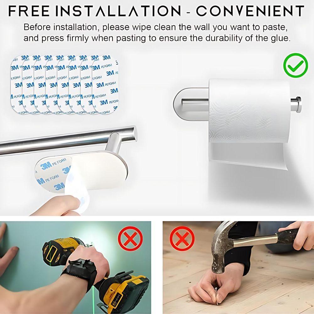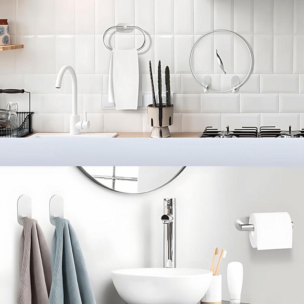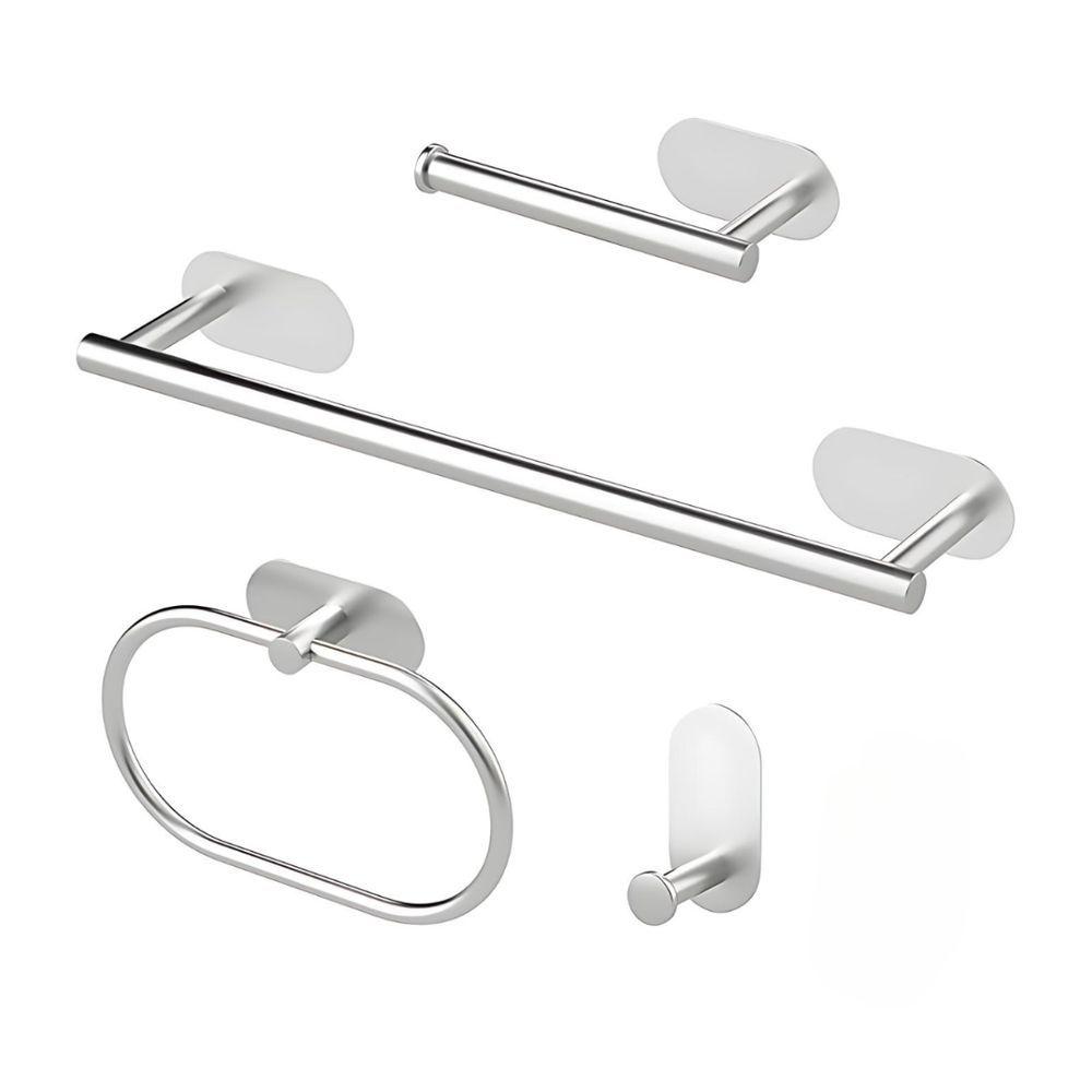 Kit Acessorios Banheiro Aço Inox Autoadesivo 4 Peças PrataKit com 4 acessórios de banheiro feito em inox, de alta qualidade.Ideal para tornar seu banheiro completo, elegante e organizado.Com nossos acessórios, a instalação é simples e não há necessidade de danificar a parede.Características:- Material: Aço Inox- Durabilidade elevada- Instalação por adesivo 3M resistente até 6 kgs por peça, sem danificar a parede (aguardar 48 hrs para uso após instalação)Kit de 4 acessórios de banheiro1. Porta toalha BanhoComprimento: 39,6 cmAltura: 4,5 cmProfundidade: 8 cm2. GanchoComprimento: 5 cmAltura: 10 cmProfundidade: 4 cm3. Porta Papel higienicoComprimento: 16 cmAltura: 4,5 cmProfundidade: 8 cm4. Porta Toalha RedondoComprimento: 20 cmAltura: 4 cmProfundidade: 13 cm4. Acessório para pendurar roupaComprimento: 4,5 cmAltura: 10 cmProfundidade: 4 cmO kit inclui:Um espaçoso Porta-Toalha de Banho (39,6 cm de comprimento, 4,5 cm de altura, 8 cm de profundidade), ideal para suas toalhas maiores.Um prático Gancho (5 cm de comprimento, 10 cm de altura, 4 cm de profundidade), perfeito para pendurar roupões ou toalhas de mão.Um funcional Porta-Papel Higiênico (16 cm de comprimento, 4,5 cm de altura, 8 cm de profundidade), mantendo o rolo sempre ao alcance.Um elegante Porta-Toalha Redondo (20 cm de comprimento, 4 cm de altura, 13 cm de profundidade), adicionando um toque de sofisticação.Com este kit, você desfrutará de um banheiro impecável, moderno e livre de furos, combinando funcionalidade e design superior.