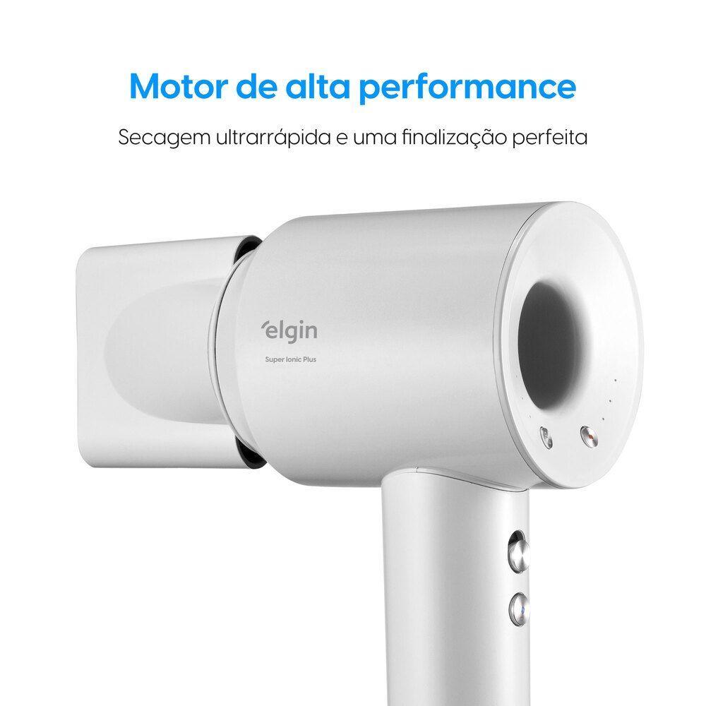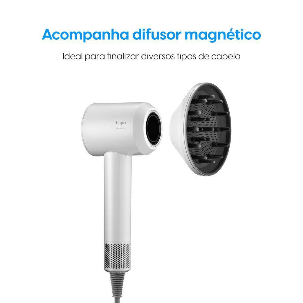 Secador De Cabelo Super Ionic 1700W Branco Motor BLDC 3 Temperaturas Jato Frio Com Difusor 110VO Secador de Cabelo Super Ionic Plus da Elgin é a escolha perfeita para quem busca tecnologia, eficiência e conforto na secagem e finalização dos cabelos.Equipado com um potente motor BLDC (Brushless Direct Current), oferece alta performance com baixo consumo de energia, além de ser leve e silencioso.Seu grande diferencial é a presença de um difusor, que permite uma finalização perfeita e é ideal para cabelos ondulados, cacheados e crespos. Também possui um bocal magnético de fácil encaixe para ajustes rápidos e maior controle no direcionamento do fluxo de ar.Com tensão 110V e 1.700W de potência, seca rápido e de maneira eficiente.São 3 velocidades e 3 temperaturas que garantem ajustes precisos para diferentes tipos de cabelo e finalizações, além do jato de ar frio que ajuda a fixar os penteados para um acabamento profissional sem sair de casa.Por fim, conta com sensor inteligente de temperatura que estabiliza o calor, evita o superaquecimento e protege a saúde dos fios.O Super Ionic Plus é o secador completo para quem valoriza praticidade e alto desempenho no dia a dia.