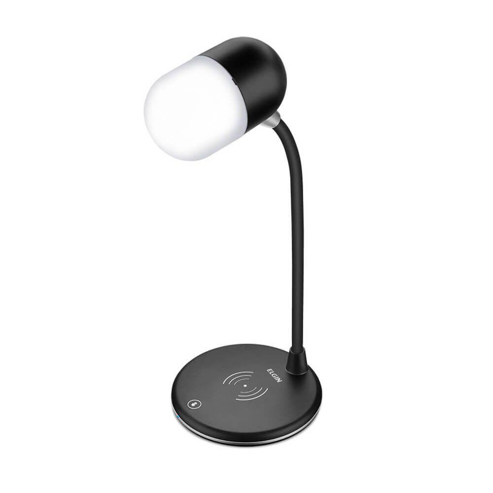Luminária De Mesa Led Lumi Play - Carregamento Por Indução Caixa De Som Bluetooth PretaCom a Luminária de Mesa de Led Lumi Play 3 em 1 da Elgin você tem um ambiente sempre bem iluminado para suas horas de trabalho ou estudo. Ela é equipada com lâmpada de Led e é ideal para ambientes internos como quartos, pois seu design exclusivo faz dessa peça um modelo diferenciado que combina com decorações joviais e modernas.A luminária conta com 3 níveis de iluminação: fria, neutra e morna, dando liberdade para que você controle a intensidade da luz da maneira que mais agradar, deixando o seu cômodo com um ar acolhedor e aconchegante.Possui haste flexível, ou seja, você pode movimentar e colocar o foco de luz onde for necessário, possui botão touch e conta com cabo carregador USB para recarregar sua bateria bivolt. Além disso, ela também funciona como caixa de som Bluetooth ou carregamento por indução para aparelhos que utilizem essa tecnologia.O carregador de celular por indução (sem fio) é compatível somente com aparelhos que já possuem a tecnologia de carregamento sem fio.