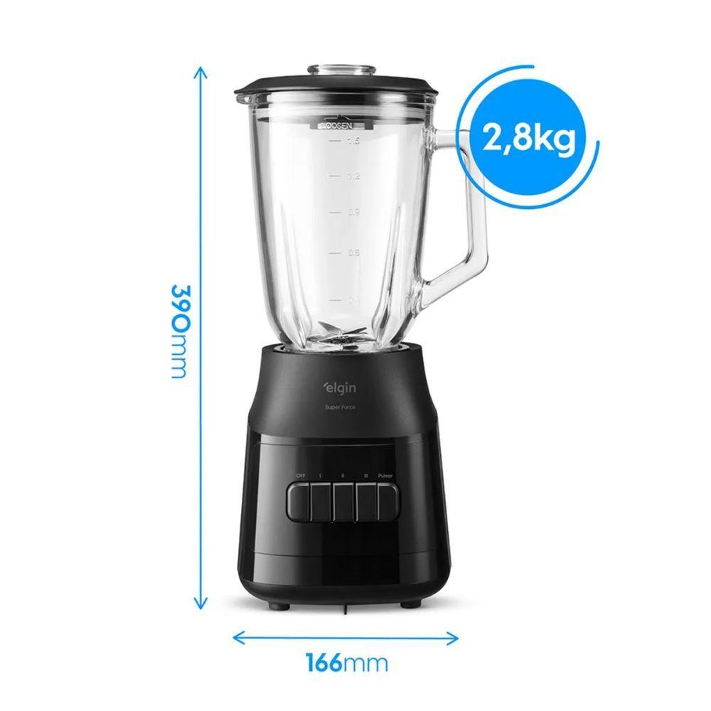 Liquidificador Super Force 1,9L 900W Preto e Jarra de Vidro 220VCom capacidade total de 1,9L, 900W de potência e equipado com uma jarra de vidro resistente, ele mistura e tritura ingredientes com rapidez e eficiência e permite o preparo de diversas receitas, quentes ou frias, como sopas, molhos, vitaminas e smoothies. Além disso, a jarra pode ir na lava-louças, o que torna a limpeza mais prática, assim como suas lâminas removíveis.O Super Force conta com 3 velocidades e função pulsar, ideais para triturar gelo e alimentos mais duros. Sua lâmina de aço inoxidável resiste à ferrugem, oferece alta durabilidade e ainda garante cortes precisos e misturas homogêneas.Por fim, o modelo conta com pés antiderrapantes que garantem maior estabilidade durante o uso, e tampa com copo dosador, permitindo medir e adicionar ingredientes sem precisar remover a tampa.Transforme sua rotina na cozinha com o Liquidificador Super Force Elgin: potência, praticidade e resultados incríveis em todas as receitas.Características:1,9L de capacidadeJarra de vidro resistentePotência de 900WMistura e tritura com eficiência3 velocidades + função pulsarLâmina em aço inoxFaca removívelVersões 110V e 220VTampa com copo dosadorPés antiderrapantesJarra compatível com lava-louçasGarantia expressa de 1 anoEspecificações Técnicas:Nome do produto: Liquidificador Super Force 1,9L 220V 900W Preto e Jarra de VidroVoltagem: 220VEAN: 7908412519192