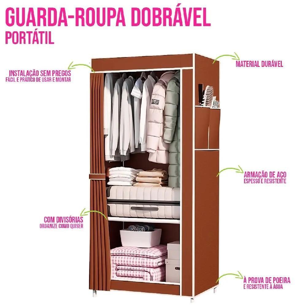 Guarda Roupa Organizador Multiuso Cabideiro Prateleira Estante Portatil Quarto Closet Loja MarromGuarda-Roupa Portátil Dobrável com Prateleiras e Cabideiro – Solução Elegante para Espaços CompactosDescubra a solução perfeita para organizar suas roupas com o Guarda-Roupa Portátil Dobrável. Com suas dimensões compactas de 55x45x150 cm, este armário oferece uma combinação ideal de funcionalidade e estilo, sendo a escolha perfeita para quem precisa de armazenamento eficiente em espaços reduzidos.Características Principais:Design Prático e Funcional: Equipado com divisões verticais inteligentes, o guarda-roupa inclui grandes espaços com cabideiro e prateleiras. Este design permite organizar ternos, vestidos, jaquetas e camisas de forma eficiente, mantendo seus itens pessoais sempre ao alcance e bem arrumados.Proteção Contra Poeira: As tampas de enrolar são uma característica essencial que ajuda a manter a poeira e sujeira afastadas. Seus itens ficarão limpos e protegidos, garantindo que suas roupas estejam sempre em ótimo estado.Material de Alta Qualidade: Fabricado em tecido respirável de alta qualidade, este guarda-roupa não apenas é fácil de limpar, mas também é durável e resistente. A escolha perfeita para quem valoriza um produto de longa duração e manutenção simples.Fácil Montagem: A montagem é simples e rápida, oferecendo uma solução prática para organizar suas roupas sem complicação. Em poucos minutos, você terá um guarda-roupa funcional e pronto para uso.Dimensões e Especificações:Dimensões: 55 cm (largura) x 45 cm (profundidade) x 150 cm (altura)Material: Tecido respirável de alta qualidadeO Guarda-Roupa Portátil Dobrável com Prateleiras e Cabideiro é a escolha ideal para quem busca uma solução prática e elegante para organizar roupas em ambientes compactos. Perfeito para qualquer espaço reduzido, ele combina eficiência e estilo, proporcionando uma alternativa moderna aos guarda-roupas tradicionais.Guarda-Roupa Portátil Dobrável com Prateleiras e Cabideiro – Solução Elegante para Espaços CompactosDescubra a solução perfeita para organizar suas roupas com o Guarda-Roupa Portátil Dobrável. Com suas dimensões compactas de 55x45x150 cm, este armário oferece uma combinação ideal de funcionalidade e estilo, sendo a escolha perfeita para quem precisa de armazenamento eficiente em espaços reduzidos.Características Principais:Design Prático e Funcional: Equipado com divisões verticais inteligentes, o guarda-roupa inclui grandes espaços com cabideiro e prateleiras. Este design permite organizar ternos, vestidos, jaquetas e camisas de forma eficiente, mantendo seus itens pessoais sempre ao alcance e bem arrumados.Proteção Contra Poeira: As tampas de enrolar são uma característica essencial que ajuda a manter a poeira e sujeira afastadas. Seus itens ficarão limpos e protegidos, garantindo que suas roupas estejam sempre em ótimo estado.Material de Alta Qualidade: Fabricado em tecido respirável de alta qualidade, este guarda-roupa não apenas é fácil de limpar, mas também é durável e resistente. A escolha perfeita para quem valoriza um produto de longa duração e manutenção simples.Fácil Montagem: A montagem é simples e rápida, oferecendo uma solução prática para organizar suas roupas sem complicação. Em poucos minutos, você terá um guarda-roupa funcional e pronto para uso.Dimensões e Especificações: Dimensões: 55 cm (largura) x 45 cm (profundidade) x 150 cm (altura) Material: Tecido respirável de alta qualidadeO Guarda-Roupa Portátil Dobrável com Prateleiras e Cabideiro é a escolha ideal para quem busca uma solução prática e elegante para organizar roupas em ambientes compactos. Perfeito para qualquer espaço reduzido, ele combina eficiência e estilo, proporcionando uma alternativa moderna aos guarda-roupas tradicionais.