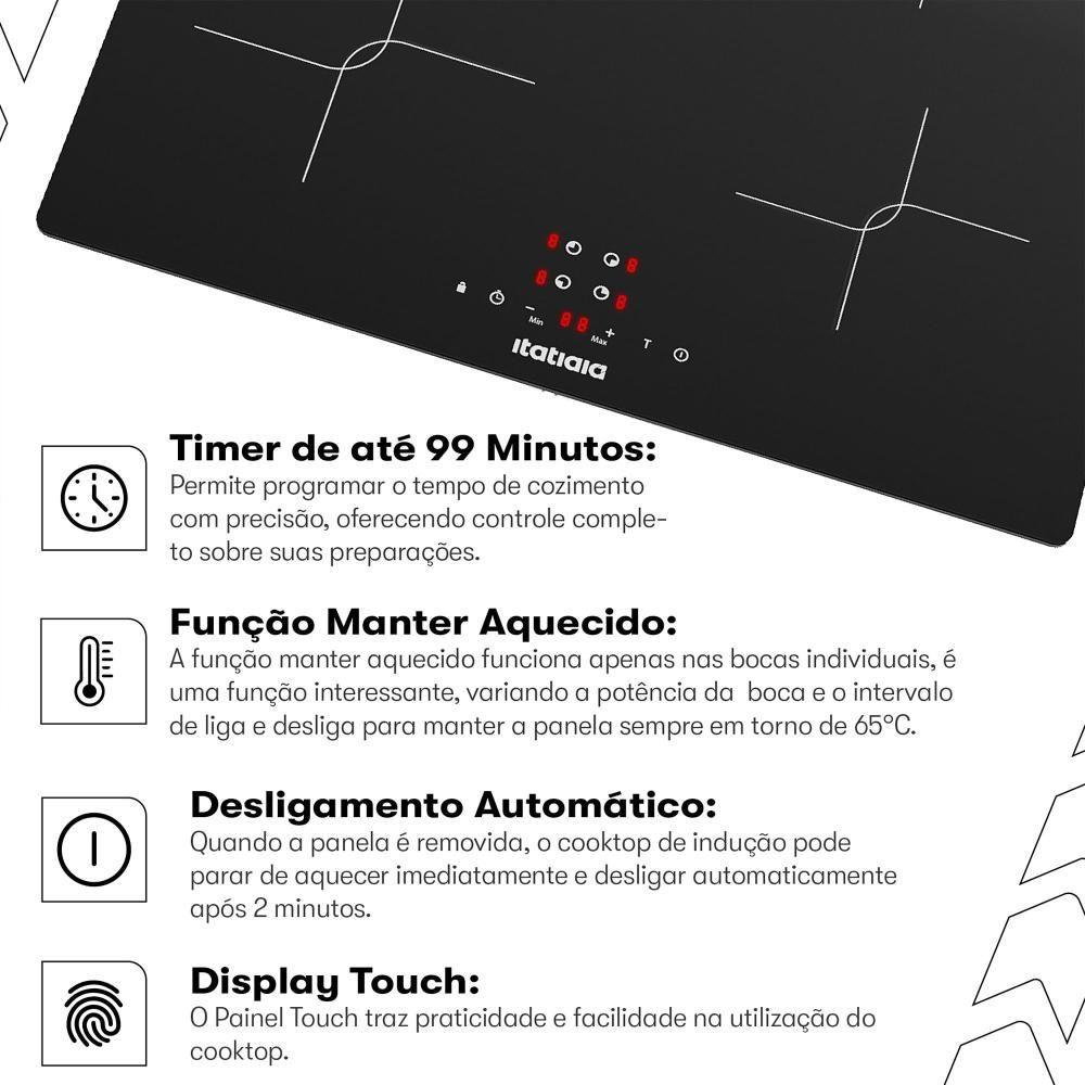 Cooktop De Indução Itatiaia Master 4Q 220VTransforme sua cozinha com o Cooktop de Indução Itatiaia Master 4Q 220V. Ideal para quem busca potência, e eficiência, este cooktop é perfeito para preparar suas refeições com rapidez e precisão. Confira suas características:7000W de Potência: Potência robusta para um cozimento rápido e eficiente.Maior : Tecnologia de indução que evita queimaduras e aumenta a na cozinha.Proteção Contra Derramamento: Evita acidentes e facilita a limpeza.Detecção de Panela: O cooktop só ativa quando uma panela está corretamente posicionada.Modo Potência/Temperatura: Ajuste preciso para atender às suas necessidades de cozimento.Timer de Até 99 Minutos: Controle exato do tempo de preparo dos seus pratos.4 Queimadores: Versatilidade para preparar vários pratos simultaneamente.Embutir: Design elegante e moderno que se integra perfeitamente à sua cozinha.9 Níveis de Potência: Flexibilidade para ajustar a intensidade de acordo com o tipo de receita.O Cooktop de Indução Itatiaia Master 4Q 220V oferece uma combinação imbatível de potência, e estilo para sua cozinha. Aproveite a inovação e a eficiência deste produto para elevar suas habilidades culinárias!NÃO FATURAMOS PARA CNPJVoltagem: 220V | Tipo de Montagem: De embutir | Quantidade de Bocas: 4 Bocas