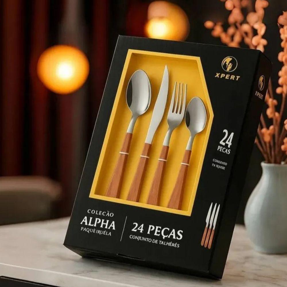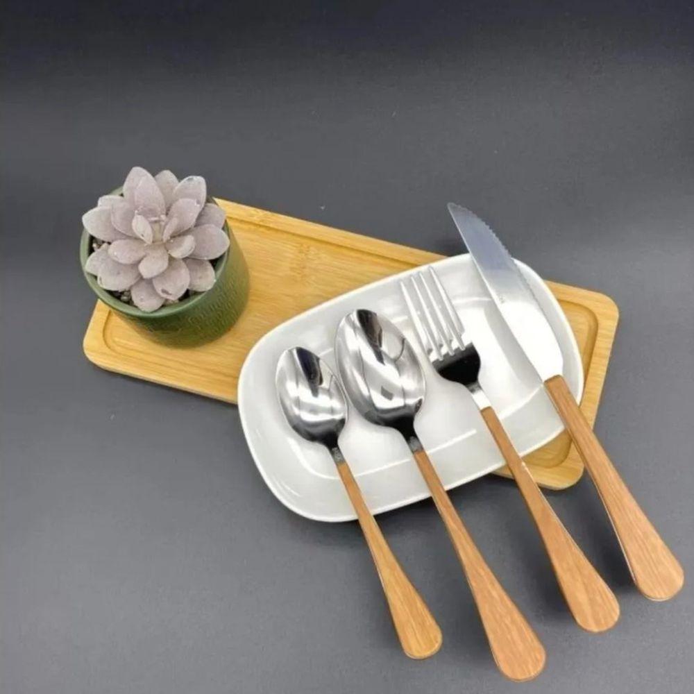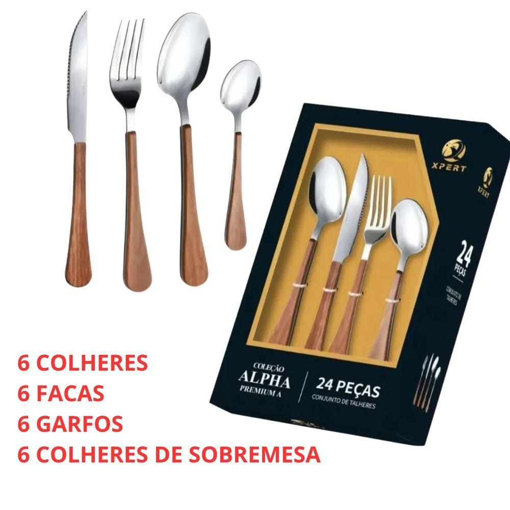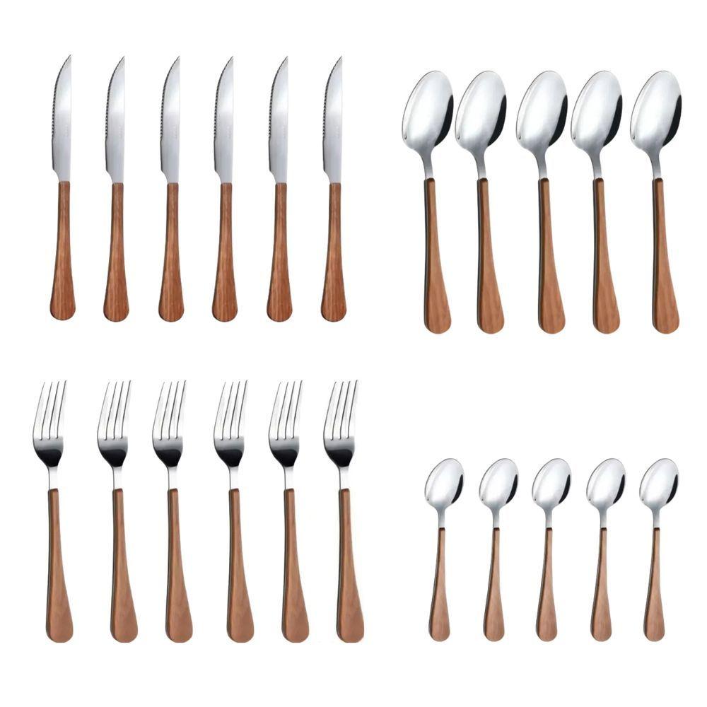 Jogo De Talheres 24 Peças Madeira Inox Premium Para Churrasco