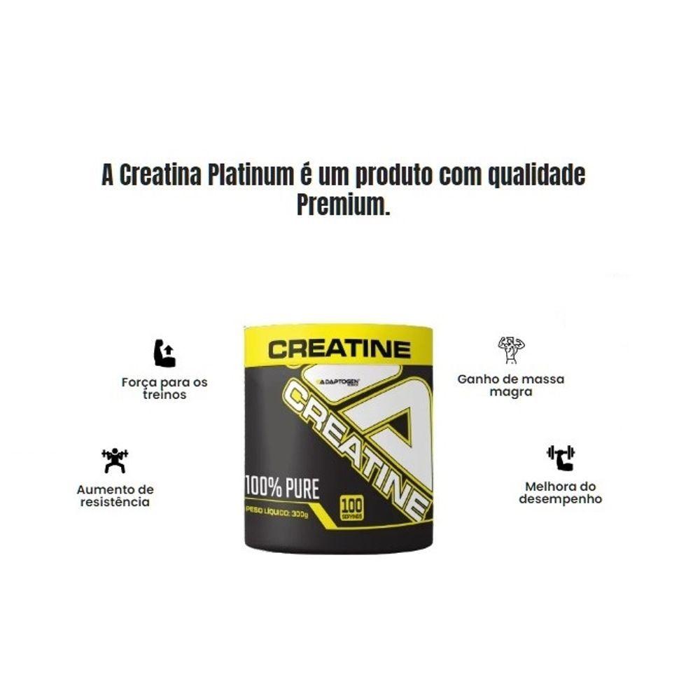 Creatina 100% Pure Adaptogen 300gCreatine 100% Pure (300g) - Adaptogen A Creatina é um dos suplementos alimentares com mais estudos comprovando sua eficácia. Ela é um aminoácido de origem animal, mas que também é produzida pelo nosso próprio corpo. Além de auxiliar no aumento de força, aumentar a resistência anaeróbia, ela reduz o dano muscular e a dor causada por exercícios. Ela é essencial para os praticantes de atividades físicas que buscam o ganho de massa muscular. A Creatine 100% Pure é um produto com qualidade premium, aprovado pela ANVISA e entrega 100% do que está no rótulo. Todos os produtos da Adaptogen Science passam por rigorosos testes antes de serem distribuídos, prática que faz com que os consumidores confiem e atestem a qualidade dos suplementos que estão consumindo.Benefícios:* Auxilia no ganho de força;* Mais explosão e resistência ao esforço físico;* Reposição dos níveis de ATP;* Melhora de performance;* Auxilia no ganho de massa muscular;* Hipertrofia muscular.Informação NutricionalCreatine 100% Pure (300g) - Adaptogen Porção de 3g (1 scoop)Quantidade por porção%VD(*)Creatina3.000mg*** % Valores Diários com base em uma dieta de 2.000Kcal ou 8400kJ. Seus valores diários podem ser maiores ou menores dependendo das suas necessidades energéticas. Obs: Pode haver pequenas variações na informação nutricional, de acordo com o sabor.