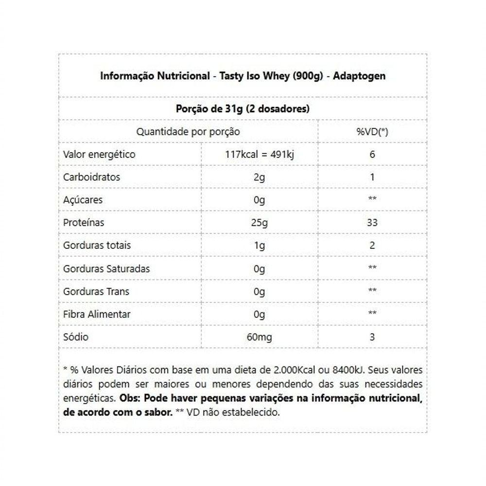 Whey Protein Isolado Tasty Iso Adaptogen 900g - Sabor Vanilla SundaeTasty Iso Whey (900g) Tasty Iso, proteína isolada e hidrolisada que, garante rápida absorção pelo organismo, recuperação pós-treino, ricos nutrientes para otimizar os resultados e com delicioso sabor. É processado a frio, mantendo os benefícios de seus ingredientes, entre eles, dos aminoácidos com fatores imunes anti-inflamatórios e peptídeos que estimulam o metabolismo, juntamente com os antioxidantes e minerais alcalinos. Não possui lactose, glúten, tem baixo índice de carboidrato e gorduras. Tasty Iso é fabricado com a prática de processamento mais avançada, o que garante sua qualidade. Dessa forma, Tasty Iso se torna fonte rica em proteínas de maior valor biológico (VB), o que significa que mais proteínas são absorvidas pelo seu corpo e rapidamente. Cada dose oferece 5,5 g de BCAA?s, incluindo 2,6 g de Leucina e todas as micro frações intactas encontradas em um isolado de proteína de soro de leite de qualidade. --* O melhor Whey Protein 100% isolado do mercado: Tasty Iso, alta qualidade e muito saborosa. Solução ideal para seus desafios diários! Benefícios: - Melhora o desempenho muscular;- Ajuda a prevenir e tratar a diabete;- Auxilia o ganho de massa magra;- açúcares e lactose;- 25g de proteínas por porção;- Mais de 5,5 g de BCAAs por dose;- Rápida absorção.- Melhora o desempenho muscular- Ajuda a prevenir e tratar a diabete- Auxilia o ganho de massa magra- açúcares e lactose- 25g de proteínas por porção