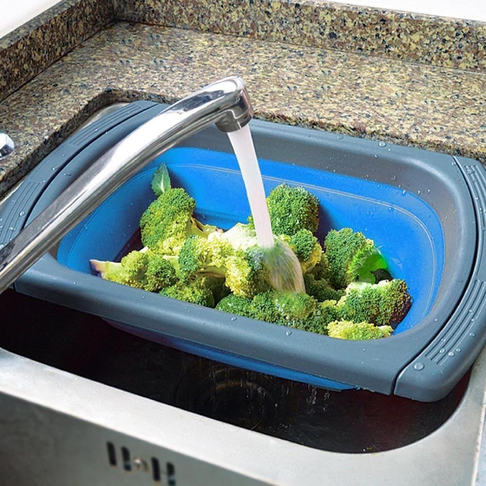 Escorredor Pia Silicone Retratil Alca Ajustavel Massas Macarrao Legumes Frutas Grande Azul