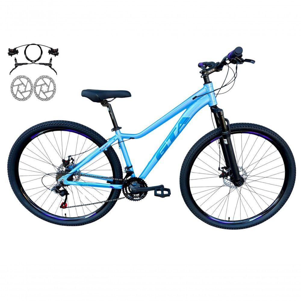 Bicicleta Aro 29 Gta Start Freio Hidráulico 21v Alumínio Mountain Bike Garfo Suspensão Azul/Roxo Tam: 15Linda bike aro 29 em alumínio, nova na caixa a pronta entrega, produto com ótima qualidade e acabamento, possui 21 marchas com sistema de alavancas rapid fire que a cada clique uma marcha é trocada, garfo com suspensão, sistema de freio a disco hidráulico. Segue abaixo características da bike:Quadro Gta Start AlumínioGarfo 29 suspensão curso 60mmSuporte do guidão em alumínio pretoGuidão 31.8mm pretoCanote do selim 27.2Selim Sport pretoAbraçadeira do Selim alumínio PretoAros Aero Parede dupla reforçadoRaios PretosCubos Pretos com blocagensPneus 29 CravudinhosMovimento central selado rolamentadoFreios a disco Hidráulico com discos inox 160mmAlavancas Semi-automáticas Rapid FireCâmbio Traseiro Index ImportadoCâmbio Dianteiro ImportadoCorrente IndexPedivela Aço RevestidoPedal Plataforma Nylon pretoRoda Livre 7v index (rosca)Bicicleta pré montada, vai precisar apenas fixar a roda dianteira, guidão, selim e pedais. Recomendamos que seja feita uma revisão por um técnico após a recebimento do produto, para reajuste e regulagem, pois no transporte pode acontecer de alguma peça soltar ou desregularFotos meramente ilustrativas