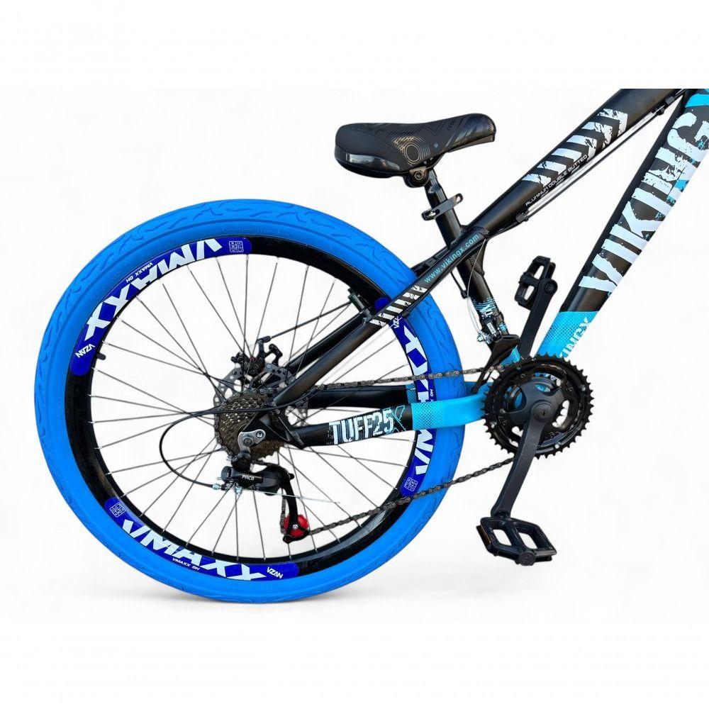 Bicicleta Aro 26 Vikingx Tuff Câmbios Shimano Freio Hidráulico 21v Freeride Aro Vmaxx Flame preto/Azul X25Bike aro 26, vikingx tuff, nova na caixa a pronta entrega, produto com ótima qualidade e acabamento, possui 21 marchas com sistema de alavancas rapid fire que a cada clique uma marcha é trocada, Câmbios Shimano, sistema de freio a disco hidráulico, pneu flame. Segue abaixo características da bike:Quadro 26 VikingX Tuff em AlumínioGarfo suspensão aço pretoSuporte do guidão em alumínio pretoGuidão 31.8mm em alumínio pretoCanote do selim 27.2 em alumínio preto Sem carrinhoSelim GTA Freeride PretoAbraçadeira do Selim alumínio PretoAros Vmaxx DH Super reforçadosRaios PretosCubos PretosPneus 26x2.125 FlameMovimento central selado rolamentadoFreios a disco hidráulico com discos inox 160mmAlavancas Semi-automáticas Rapid FireCâmbio Traseiro Shimano TZCâmbio Dianteiro Shimano TZCorrente IndexPedivela Aço RevestidoPedal Plataforma Nylon pretoRoda Livre 7v indexBicicleta pré montada, vai precisar apenas fixar a roda dianteira, guidão, selim e pedais. Recomendamos que seja feita uma revisão por um técnico após a recebimento do produto, para reajuste e regulagem, pois no transporte pode acontecer de alguma peça soltar ou desregularFotos meramente ilustrativas