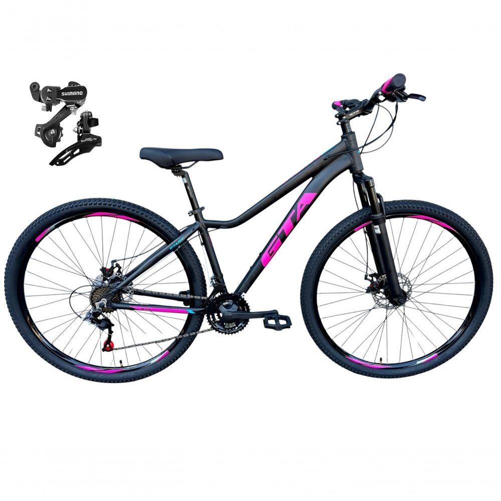 Bicicleta Aro 29 Gta Start Câmbios Shimano 21v Freio A Disco Mountain Bike Alumínio preto/rosa Tam: 15Linda bike aro 29 em alumínio, nova na caixa a pronta entrega, produto com ótima qualidade e acabamento, possui 21 marchas com sistema de alavancas rapid fire que a cada clique uma marcha é trocada, câmbios Shimano, garfo com suspensão, sistema de freio a disco mecânico. Segue abaixo características da bike:Quadro Gta Start AlumínioGarfo 29 suspensão curso 60mmSuporte do guidão em alumínio pretoGuidão 31.8mm pretoCanote do selim 27.2Selim Sport pretoAbraçadeira do Selim alumínio PretoAros Aero Parede dupla reforçadoRaios PretosCubos Pretos com blocagensPneus 29 CravudinhosMovimento central selado rolamentadoFreios a disco Mecânicos com discos inox 160mmAlavancas Semi-automáticas Rapid FireCâmbio Traseiro Shimano TZCâmbio Dianteiro Shimano TZCorrente IndexPedivela Aço RevestidoPedal Plataforma Nylon pretoRoda Livre 7v index (rosca)Bicicleta pré montada, vai precisar apenas fixar a roda dianteira, guidão, selim e pedais. Recomendamos que seja feita uma revisão por um técnico após a recebimento do produto, para reajuste e regulagem, pois no transporte pode acontecer de alguma peça soltar ou desregularFotos meramente ilustrativas