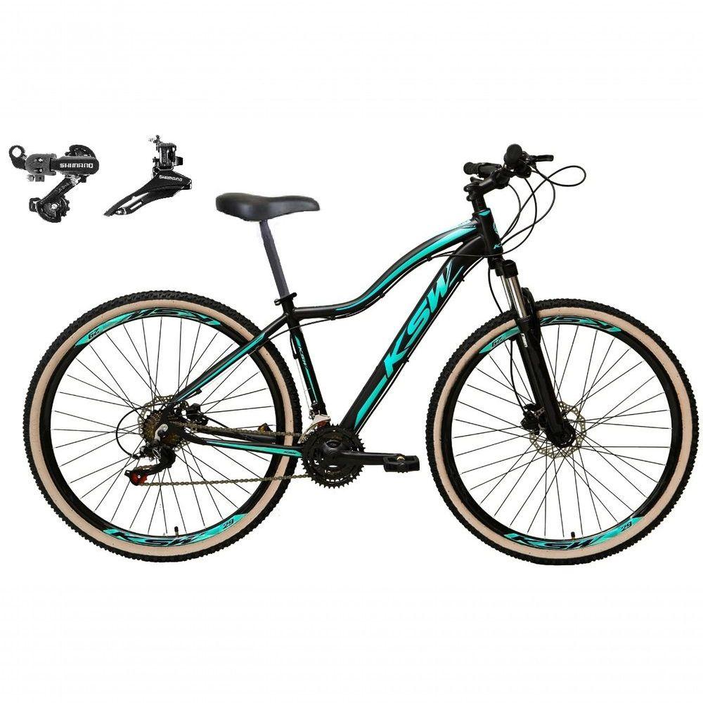 Bicicleta Aro 29 Ksw Mwza Feminina Câmbios Shimano 24v Aluminio Freio A Disco Garfo Suspensão preto/Azul Tam: 17Linda bike aro 29 em alumínio, nova na caixa a pronta entrega, produto com ótima qualidade e acabamento, possui 24 marchas com sistema de alavancas rapid fire que a cada clique uma marcha é trocada, câmbios Shimano, garfo com suspensão, sistema de freio a disco mecânico. Segue abaixo características da bike:Quadro Ksw Mwza AlumínioGarfo 29 suspensão curso 60mmSuporte do guidão em alumínio pretoGuidão 31.8mm pretoCanote do selim 27.2Selim Sport pretoAbraçadeira do Selim alumínio PretoAros Aero Parede dupla reforçadoRaios PretosCubos Pretos com blocagensPneus 29 CravudinhosMovimento central selado rolamentadoFreios a disco Mecânicos com discos inox 160mmAlavancas Semi-automáticas Rapid FireCâmbio Traseiro Shimano TZCâmbio Dianteiro Shimano TZCorrente IndexPedivela Aço RevestidoPedal Plataforma Nylon pretoRoda Livre 8v index (rosca)Bicicleta pré montada, vai precisar apenas fixar a roda dianteira, guidão, selim e pedais. Recomendamos que seja feita uma revisão por um técnico após a recebimento do produto, para reajuste e regulagem, pois no transporte pode acontecer de alguma peça soltar ou desregularFotos meramente ilustrativas