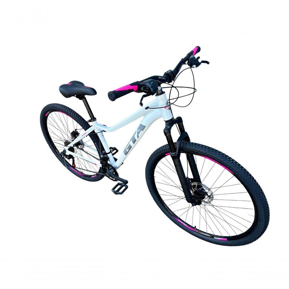 Bicicleta Aro 29 Gta Start Câmbios Shimano 21v Freio A Disco Mountain Bike Alumínio branco/cinza/rosa Tam: 15Linda bike aro 29 em alumínio, nova na caixa a pronta entrega, produto com ótima qualidade e acabamento, possui 21 marchas com sistema de alavancas rapid fire que a cada clique uma marcha é trocada, câmbios Shimano, garfo com suspensão, sistema de freio a disco mecânico. Segue abaixo características da bike:Quadro Gta Start AlumínioGarfo 29 suspensão curso 60mmSuporte do guidão em alumínio pretoGuidão 31.8mm pretoCanote do selim 27.2Selim Sport pretoAbraçadeira do Selim alumínio PretoAros Aero Parede dupla reforçadoRaios PretosCubos Pretos com blocagensPneus 29 CravudinhosMovimento central selado rolamentadoFreios a disco Mecânicos com discos inox 160mmAlavancas Semi-automáticas Rapid FireCâmbio Traseiro Shimano TZCâmbio Dianteiro Shimano TZCorrente IndexPedivela Aço RevestidoPedal Plataforma Nylon pretoRoda Livre 7v index (rosca)Bicicleta pré montada, vai precisar apenas fixar a roda dianteira, guidão, selim e pedais. Recomendamos que seja feita uma revisão por um técnico após a recebimento do produto, para reajuste e regulagem, pois no transporte pode acontecer de alguma peça soltar ou desregularFotos meramente ilustrativas