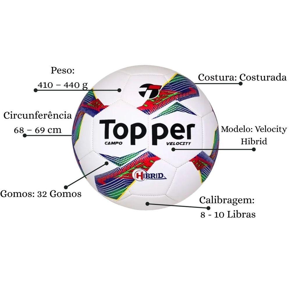 Bola De Futebol Campo Topper Velocity Hibrid Azul + Vermelho Tamanho ÚnicoBola De Futebol Campo Topper Velocity HibridAumente sua performance em campo com a Topper Velocity Hibrid, uma bola desenvolvida para quem busca resistência, precisão e estilo. Com design moderno e cores vibrantes, ela garante excelente visibilidade durante o jogo — seja em treinos ou partidas oficiais.Tecnologia e ConstruçãoLaminado Sintético PU 2.8mm: Toque macio e durabilidade mesmo em jogos intensos.Tecnologia Hibrid + TecnoFusion: Combina costura automatizada com fusão térmica, oferecendo maior resistência e vida útil.Reforço Interno: 35g de fios de nylon multiaxiais impregnados em borracha natural — mais estabilidade e desempenho.Câmara de Butil: Miolo siliconado substituível, mantendo a calibragem ideal entre 8 e 10 libras.Teste de Qualidade: Suportou 2.000 chutes a 50 km/h — prova de sua robustez em alto nível.Características Técnicas:Material externo: Laminado sintético PU/PVC de 2.8 mmTecnologia Hibrid: Une a precisão da costura automatizada com a durabilidade da TecnoFusionEstrutura interna: Reforçada com 35g de fios de nylon multiaxiais impregnados com borracha naturalCâmara: Butil com miolo siliconado e substituívelCostura: CosturadaGomos: 32Peso: 410–440gCircunferência: 68–69 cmCalibragem recomendada: 8–10 librasGarantia: 30 dias contra defeito de fabricação