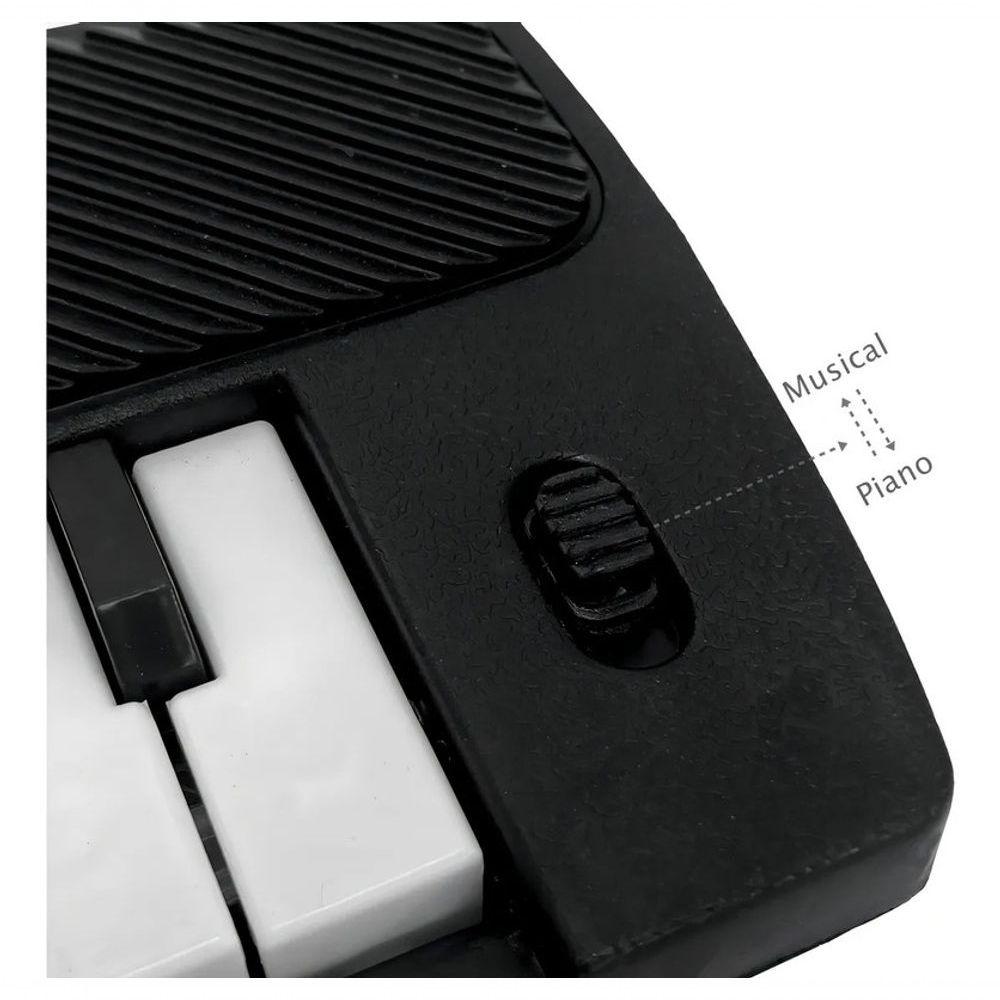 Teclado Piano Musical Brinquedo Educativo Criança Som ElétriTeclado Infantil Musical 27 cm, 14 teclas – Com Sons de Piano e Melodias | Brinquedo Educativo para Crianças a Partir de 4 AnosIncentive a criatividade e o gosto pela música com o Teclado Infantil Black 27 cm. Desenvolvido especialmente para crianças, esse brinquedo musical proporciona momentos de diversão enquanto estimula habilidades essenciais como percepção auditiva, coordenação motora e concentração.Fabricado em plástico resistente e com design compacto, o teclado conta com 14 teclas funcionais e dois modos de uso: som de piano e reprodução de melodias. Ideal para o desenvolvimento musical infantil desde os primeiros anos, é perfeito para brincadeiras educativas em casa ou na escola.Destaques do produto:2 modos de som: piano e músicas automáticas14 teclas funcionais (as teclas pretas são decorativas)Estimula a percepção sonora e o desenvolvimento cognitivoIdeal para crianças a partir de 4 anosLeve, compacto e fácil de transportarEspecificações técnicas:Certificação: Produto com selo do INMETROAlimentação: 2 pilhas AA (não inclusas)Dimensões aproximadas:- Comprimento: 27 cm- Largura: 9 cm- Altura: 3 cmMaterial: Plástico resistenteConteúdo da embalagem:1 Teclado Infantil MusicalProporcione às crianças uma forma divertida de aprender e brincar ao mesmo tempo. O Teclado Musical Infantil a escolha ideal para os pequenos músicos em formação.Adquira já o seu e estimule o talento musical desde cedo!