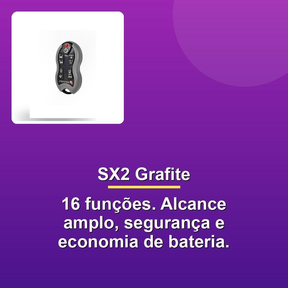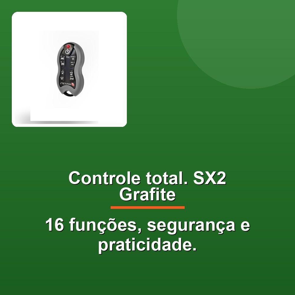 Controle Stetsom Sx2 Grafite 16 FunçõesControle seus aparelhos de áudio e vídeo automotivo ou residencial com total liberdade e praticidade a partir de qualquer lugar! O Controle Stetsom SX2 Grafite, com tecnologia de rádio frequência (RF), garante um alcance impressionante de até 500 metros em área aberta, permitindo que você desfrute de seus equipamentos favoritos sem se preocupar com fios e limitações de espaço.Com 16 funções e sincronismo fácil, o SX2 oferece controle completo sobre seus DVD players, kits multimídia e outros dispositivos compatíveis. Sua transmissão em FSK garante estabilidade e reduz interferências externas, enquanto o código criptografado e a tecnologia de código rolante impedem clonagem e garantem a segurança dos seus comandos.A praticidade do SX2 não para por aí! Ele possui indicador de bateria fraca tanto no controle quanto na central, além de diversos modelos de aparelhos pré-definidos na memória. A função Aprender permite programar comandos personalizados para outros dispositivos, e o modo econômico inteligente otimiza o consumo de bateria.Conforto, segurança e controle total em um único dispositivo. Experimente o Controle Stetsom SX2 Grafite e leve a experiência com seus equipamentos para outro nível!Controle seus aparelhos de áudio e vídeo automotivo ou residencial com total liberdade e praticidade a partir de qualquer lugar! O Controle Stetsom SX2 Grafite, com tecnologia de rádio frequência (RF), garante um alcance impressionante de até 500 metros em área aberta, permitindo que você desfrute de seus equipamentos favoritos sem se preocupar com fios e limitações de espaço.Com 16 funções e sincronismo fácil, o SX2 oferece controle completo sobre seus DVD players, kits multimídia e outros dispositivos compatíveis. Sua transmissão em FSK garante estabilidade e reduz interferências externas, enquanto o código criptografado e a tecnologia de código rolante impedem clonagem e garantem a segurança dos seus comandos.A praticidade do SX2 não para por aí! Ele possui indicador de bateria fraca tanto no controle quanto na central, além de diversos modelos de aparelhos pré-definidos na memória. A função Aprender permite programar comandos personalizados para outros dispositivos, e o modo econômico inteligente otimiza o consumo de bateria.Conforto, segurança e controle total em um único dispositivo. Experimente o Controle Stetsom SX2 Grafite e leve a experiência com seus equipamentos para outro nível!