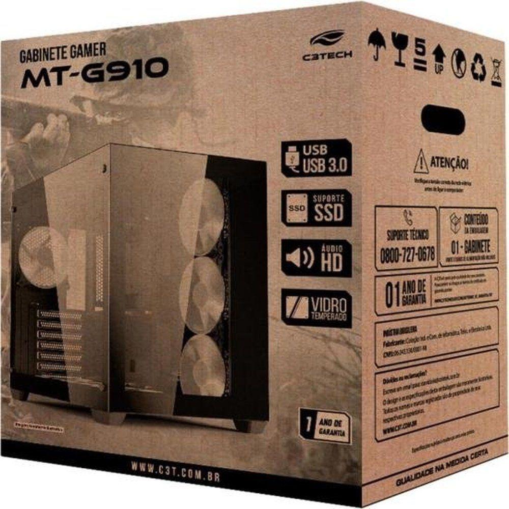 Gabinete Gamer C3tech Aquarius Mt-g910 PretoApresentamos o Gabinete Gamer C3Tech Aquarius MT-G910, a escolha ideal para você que busca performance e estilo em um único lugar. Com seu design robusto e moderno, o MT-G910 vai elevar a estética do seu setup, enquanto sua estrutura inteligente garante um fluxo de ar eficiente para manter seus componentes funcionando em temperatura ideal, mesmo durante longas horas de uso.Confeccionado em aço carbono laminado a frio com pintura anticorrosiva e antiestática, o gabinete Aquarius MT-G910 oferece durabilidade e resistência, além de lado frontal e lateral em vidro temperado para uma visualização impecável dos seus componentes. Amplo espaço interno permite a instalação de até 10 cooler fans, garantindo a refrigeração ideal para sua poderosa máquina gamer.Com compatibilidade para placas-mãe ATX, Micro ATX e Mini ITX, você tem a liberdade de escolher o hardware que melhor se adapta às suas necessidades. Não deixe de lado a praticidade, o MT-G910 conta com duas portas USB 2.0, uma porta USB 3.0, entradas P2 para áudio e microfone, além de um organizador de cabos que mantém o ambiente interno organizado e livre de fios soltos, contribuindo para a estética e a manutenção do seu sistema. A estrutura do gabinete também foi pensada para ocultar o fonte de alimentação, criando um visual minimalista e sofisticado. Prepare-se para elevar o seu jogo com o Gabinete Gamer C3Tech Aquarius MT-G910.Apresentamos o Gabinete Gamer C3Tech Aquarius MT-G910, a escolha ideal para você que busca performance e estilo em um único lugar. Com seu design robusto e moderno, o MT-G910 vai elevar a estética do seu setup, enquanto sua estrutura inteligente garante um fluxo de ar eficiente para manter seus componentes funcionando em temperatura ideal, mesmo durante longas horas de uso. Confeccionado em aço carbono laminado a frio com pintura anticorrosiva e antiestática, o gabinete Aquarius MT-G910 oferece durabilidade e resistência, além de lado frontal e lateral em vidro temperado para uma visualização impecável dos seus componentes. Amplo espaço interno permite a instalação de até 10 cooler fans, garantindo a refrigeração ideal para sua poderosa máquina gamer.Com compatibilidade para placas-mãe ATX, Micro ATX e Mini ITX, você tem a liberdade de escolher o hardware que melhor se adapta às suas necessidades. Não deixe de lado a praticidade, o MT-G910 conta com duas portas USB 2.0, uma porta USB 3.0, entradas P2 para áudio e microfone, além de um organizador de cabos que mantém o ambiente interno organizado e livre de fios soltos, contribuindo para a estética e a manutenção do seu sistema. A estrutura do gabinete também foi pensada para ocultar o fonte de alimentação, criando um visual minimalista e sofisticado. Prepare-se para elevar o seu jogo com o Gabinete Gamer C3Tech Aquarius MT-G910.