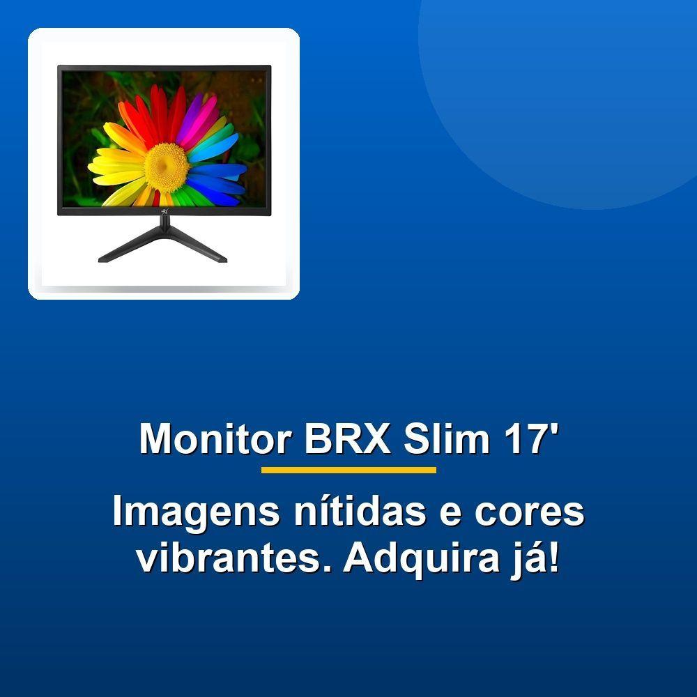 Monitor Brx Slim Led 17 Hdmi VgaDescubra a excelência visual com o Monitor BRX Slim 17’’ LED. Com uma proporção de tela 4:3 e resolução de 1280x1024 pixels, ele oferece imagens nítidas e detalhadas. O brilho de 250CD/m² e a taxa de contraste de 1000:1 garantem cores vibrantes e realistas. Com um tempo de resposta de 3.8/1.2 ms e taxa de atualização de até 75Hz, desfrute de transições suaves. Equipado com interfaces HDMI e VGA, é versátil para diversas conexões. Acompanha base, adaptador AC e cabos, proporcionando uma experiência completa e prática.Descubra a excelência visual com o Monitor BRX Slim 17’’ LED. Com uma proporção de tela 4:3 e resolução de 1280x1024 pixels, ele oferece imagens nítidas e detalhadas. O brilho de 250CD/m² e a taxa de contraste de 1000:1 garantem cores vibrantes e realistas. Com um tempo de resposta de 3.8/1.2 ms e taxa de atualização de até 75Hz, desfrute de transições suaves. Equipado com interfaces HDMI e VGA, é versátil para diversas conexões. Acompanha base, adaptador AC e cabos, proporcionando uma experiência completa e prática.