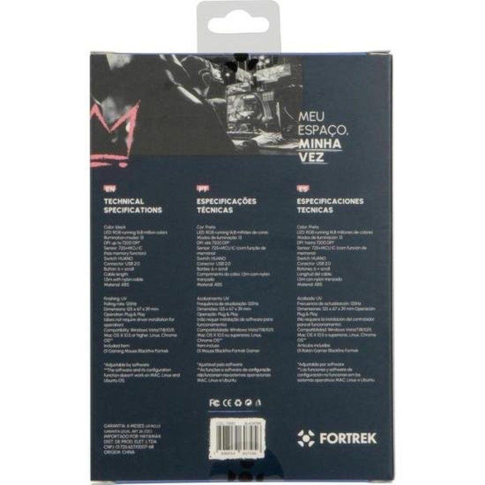 Mouse Gamer Fortrek Blackfire RgbDesbloqueie seu potencial gamer com o Fortrek Blackfire RGB! Com um design moderno e confortável, este mouse gamer é perfeito para ambos canhotos e destros, garantindo uma jogabilidade e controle de movimentos excelentes. A cor roxa em destaque em nossa nova embalagem representa a nossa marca e a sua escolha.Oferecemos 13 modos de iluminação LED RGB, com uma capacidade de 16,8 milhões de cores, para uma experiência de jogo personalizada e atraente. Adicione um toque extra com nosso switch Huano e 6 botões de comando + Scroll em silicone suave, proporcionando mais aderência ao toque. O mouse Blackfire é construído com plástico ABS de alta resistência e acabamento UV, garantindo uma durabilidade excepcional.Personalize seu dispositivo com nosso software avançado, que permite configurar macro scripts, atribuir botões, iluminação e configurações de modo. Salve seus perfis em seu computador para acesso fácil e rápido. Instale o mouse em sua porta USB e comece a explorar. Nota: as funções e configuração não são compatíveis com MAC, Linux, Ubuntu.Descubra a potência do Fortrek Blackfire RGB, com uma resolução máxima de 7200 DPI, conector USB 2.0 e sensor 725+MCU IC. Compatível com Windows Vista, Windows 7/8/10/11 e Linux, Chrome OS. Frequência de atualização de 125Hz, para uma experiência de jogo suave e preciso.Desbloqueie seu potencial gamer com o Fortrek Blackfire RGB! Com um design moderno e confortável, este mouse gamer é perfeito para ambos canhotos e destros, garantindo uma jogabilidade e controle de movimentos excelentes. A cor roxa em destaque em nossa nova embalagem representa a nossa marca e a sua escolha.Oferecemos 13 modos de iluminação LED RGB, com uma capacidade de 16,8 milhões de cores, para uma experiência de jogo personalizada e atraente. Adicione um toque extra com nosso switch Huano e 6 botões de comando + Scroll em silicone suave, proporcionando mais aderência ao toque. O mouse Blackfire é construído com plástico ABS de alta resistência e acabamento UV, garantindo uma durabilidade excepcional.Personalize seu dispositivo com nosso software avançado, que permite configurar macro scripts, atribuir botões, iluminação e configurações de modo. Salve seus perfis em seu computador para acesso fácil e rápido. Instale o mouse em sua porta USB e comece a explorar. Nota: as funções e configuração não são compatíveis com MAC, Linux, Ubuntu.Descubra a potência do Fortrek Blackfire RGB, com uma resolução máxima de 7200 DPI, conector USB 2.0 e sensor 725+MCU IC. Compatível com Windows Vista, Windows 7/8/10/11 e Linux, Chrome OS. Frequência de atualização de 125Hz, para uma experiência de jogo suave e preciso.
