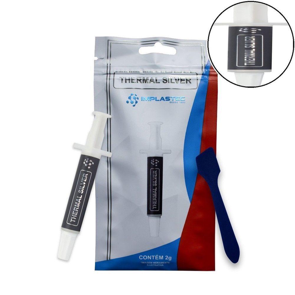 Pasta Térmica Thermal Silver 2gA Pasta Térmica Thermal Silver 2 Gramas da Implastec é a solução ideal para garantir o desempenho máximo dos seus componentes eletrônicos. Formulada com compostos especiais, esta pasta térmica oferece uma dissipação de calor superior, superando expectativas em aplicações que demandam alta performance e qualidade. Seu design garante eficiência e confiabilidade, ideal para CPUs, processadores, fontes geradoras de calor, termopares, resistências, montagens de semicondutores e uma ampla variedade de outros componentes. Com uma condutividade térmica de 1,6 W/m.K, a Thermal Silver transfere o calor com eficácia, prevenindo superaquecimento e garantindo a longevidade dos seus dispositivos.Sua cor cinza facilita a visualização e aplicação precisa, além de garantir uma aparência limpa e profissional. Com 2 gramas, você terá a quantidade ideal para diversas aplicações. Invista na Thermal Silver e libere o potencial máximo dos seus componentes, assegurando um desempenho consistente e de alta performance.A Pasta Térmica Thermal Silver 2 Gramas da Implastec é a solução ideal para garantir o desempenho máximo dos seus componentes eletrônicos. Formulada com compostos especiais, esta pasta térmica oferece uma dissipação de calor superior, superando expectativas em aplicações que demandam alta performance e qualidade. Seu design garante eficiência e confiabilidade, ideal para CPUs, processadores, fontes geradoras de calor, termopares, resistências, montagens de semicondutores e uma ampla variedade de outros componentes. Com uma condutividade térmica de 1,6 W/m.K, a Thermal Silver transfere o calor com eficácia, prevenindo superaquecimento e garantindo a longevidade dos seus dispositivos.Sua cor cinza facilita a visualização e aplicação precisa, além de garantir uma aparência limpa e profissional. Com 2 gramas, você terá a quantidade ideal para diversas aplicações. Invista na Thermal Silver e libere o potencial máximo dos seus componentes, assegurando um desempenho consistente e de alta performance.