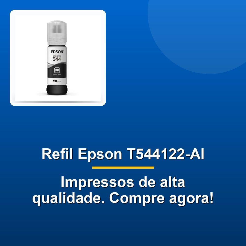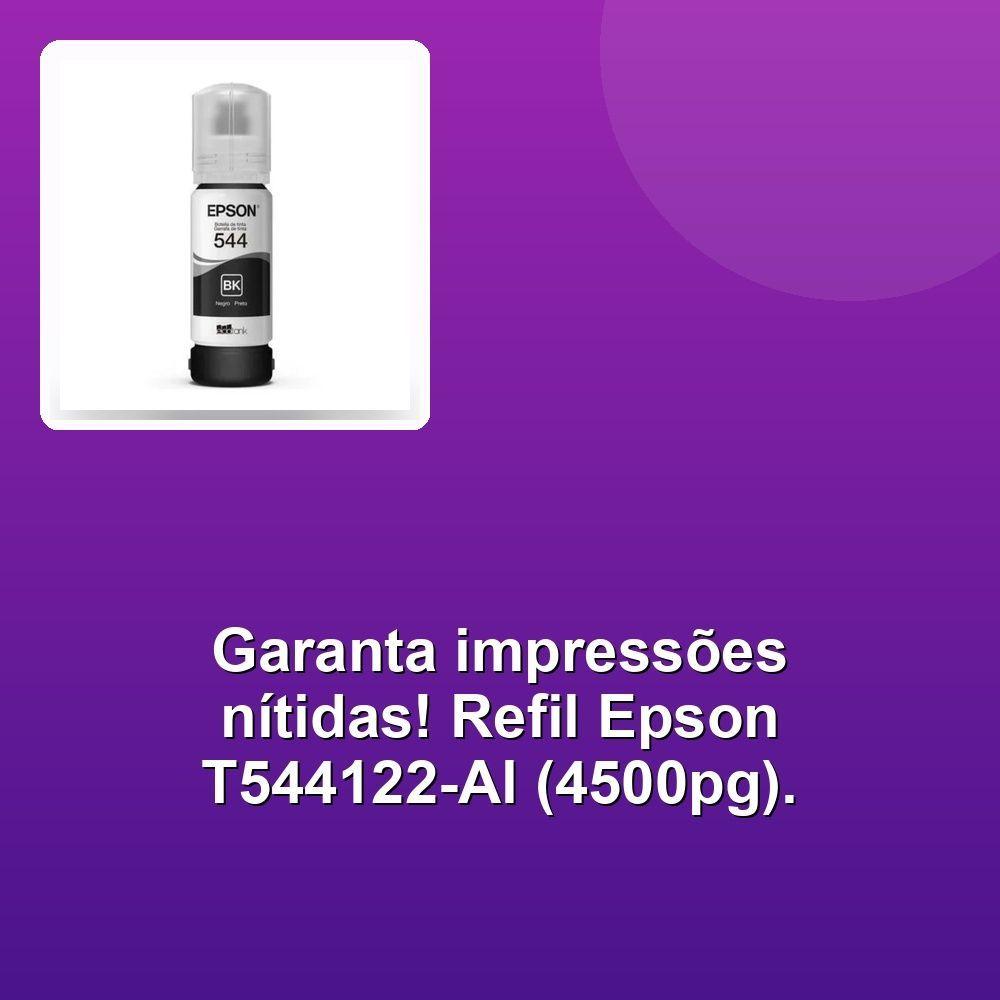 Refil De Tinta Epson T544122-al PretoDescubra a eficiência do Refil de Tinta Epson T544122-Al Preto, ideal para impressoras L1110, L3110, L3150 e L5190. Com capacidade para imprimir aproximadamente 4.500 páginas, este refil de 65ml garante impressões nítidas e de alta qualidade. Compacto e leve, mede 4 x 4 x 17,7 cm e pesa apenas 119g, facilitando o armazenamento. A confiabilidade da marca Epson é reforçada por uma garantia de 1 ano, assegurando tranquilidade e desempenho superior para suas necessidades de impressão.Descubra a eficiência do Refil de Tinta Epson T544122-Al Preto, ideal para impressoras L1110, L3110, L3150 e L5190. Com capacidade para imprimir aproximadamente 4.500 páginas, este refil de 65ml garante impressões nítidas e de alta qualidade. Compacto e leve, mede 4 x 4 x 17,7 cm e pesa apenas 119g, facilitando o armazenamento. A confiabilidade da marca Epson é reforçada por uma garantia de 1 ano, assegurando tranquilidade e desempenho superior para suas necessidades de impressão.
