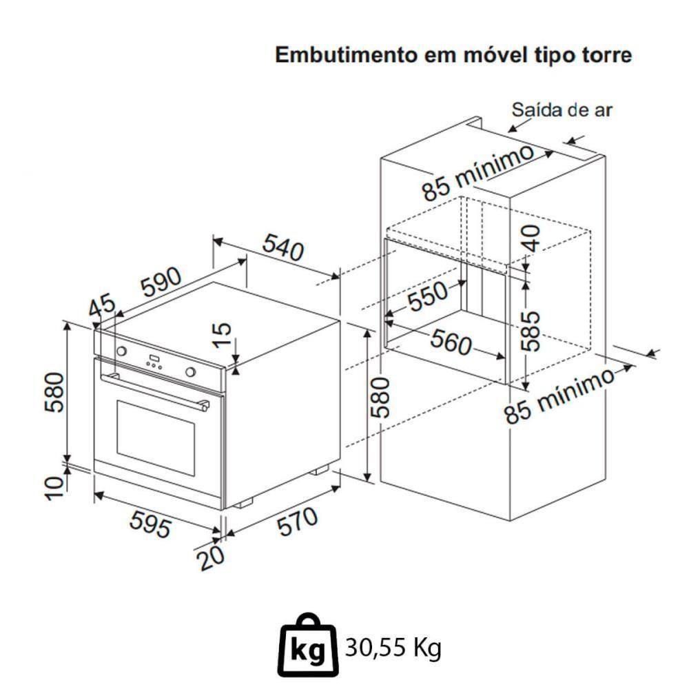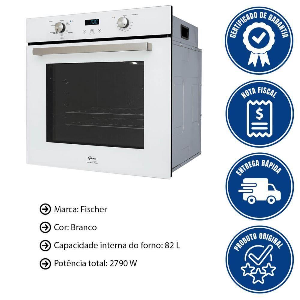 Forno Elétrico De Embutir Fischer Infinity Touch 82 Litros Branco Com Air Fryer 220V 28607(75727)- Transforme sua cozinha com o Forno Elétrico de Embutir Fischer Infinity Touch 82 litros Branco com Air Fryer.- Com design moderno e capacidade generosa de 82 litros, ele oferece funções como Air Fryer, Grill e turbo para resultados perfeitos, seja para assar, grelhar ou fritar sem óleo.- O controle touch e o display digital trazem praticidade e precisão ao seu dia a dia, enquanto o acabamento preto sofisticado adiciona elegância ao ambiente.- Com eficiência energética e tecnologia de ponta, este forno é a escolha ideal para quem busca inovação e versatilidade.- Eleve sua experiência culinária agora!FORNO ELÉTRICO DE EMBUTIR FISCHER INFINITY TOUCH 82 LITROS BRANCO COM AIR FRYER 220V 28607(75727)Marca: FischerModelo: Infinity Touch 82 Litros Branco Com Air Fryer 220V 28607(75727)DESCRIÇÃO DO FORNO ELÉTRICO DE EMBUTIR- O Forno Elétrico de Embutir Fischer Infinity Touch 82 litros com Air Fryer 220V é completo para você e sua família.- Possui timer touch screen de até 10 horas, além de função autoprogramação, deixando as refeições prontas na hora certa, com controle automático de temperatura, alcançando de 50ºC a 250°C.- Conta também com funções como: lâmpada interna, Descongelar, Turbo, Grill e Turbo Grill.- O sistema de resfriamento interno do forno evita excesso de temperatura no nicho de instalação, o que garante uma maior ao produto, evitando assim o risco de superaquecimento no interior do móvel.- A porta com vidro triplo garante ainda mais e economia de energia, pois impede a fuga de calor.- O revestimento interno é EasyClean, de fácil limpeza.INFORMAÇÕES DO FORNO ELÉTRICO DE EMBUTIR- Tensão: 220 V- Cor: Branco- Capacidade internar do forno: 82 L- Revestimento interno: Tecnologia EasyClean (de fácil limpeza)- Potência total: 2790 W- Grill/Dourador: Sim- Grade interna do forno: 2 grades cromadas, ajustáveis em até 5 posições- Lâmpada: Sim- Bandeja coletora para resíduos: Sim- Consumo: 2,79 kWh- Painel: Eletrônico digital- Timer: Touch screen de até 10 horas- Temperatura: 50°C a 250°C- Relógio: Sim- Função Turbo: Sim- Função Dourador: SimORIENTAÇÕES DO FORNO ELÉTRICO DE EMBUTIR- Desligue o Forno: Antes de qualquer procedimento de limpeza, sempre desligue o forno da tomada para garantir sua .- Limpeza Interna: Utilize um pano macio ou esponja não abrasiva com água morna e detergente neutro para limpar o interior do forno. Evite produtos abrasivos que possam danificar o revestimento.- Remoção de Gordura: Para limpar manchas de gordura ou resíduos mais difíceis, use uma solução de bicarbonato de sódio e água. Deixe agir por alguns minutos antes de limpar.- Bandejas e Acessórios: Retire as bandejas e grades para lavar separadamente com água morna e detergente. Seque bem antes de recolocá-las no forno.- Vidro da Porta: Limpe o vidro da porta com um pano úmido e detergente suave. Para remover manchas, use uma mistura de vinagre e água.- Painel Touch: Use um pano macio e seco para limpar o painel de controle. Evite o uso de líquidos diretamente no painel para não danificar os componentes eletrônicos.- Manutenção Regular: Limpe o forno regularmente após o uso para evitar o acúmulo de sujeira, facilitando a conservação do produto e garantindo maior durabilidade.PESO- 30,55 kgGARANTIA- 12 mesesDIMENSÕES- Dimensões da embalagem (Compr. X Larg. X Alt.): 67 x 65,5 x 66,5 cm- Dimensões do produto (Compr. X Larg. X Alt.): 59,3 x 59,5 x 59,5 cm- Dimensões internas do produto (Compr. X Larg. X Alt.): 46 x 47,4 x 37,8 cm- Dimensões do nicho (Compr. X Larg. X Alt.): 63,5 x 56 x 58,5 cmO PRODUTO ACOMPANHA:- 01 manual de instruções- 01 kit fixação- 01 guia de embutimento- 02 grades cromadas- 01 assadeira esmaltada