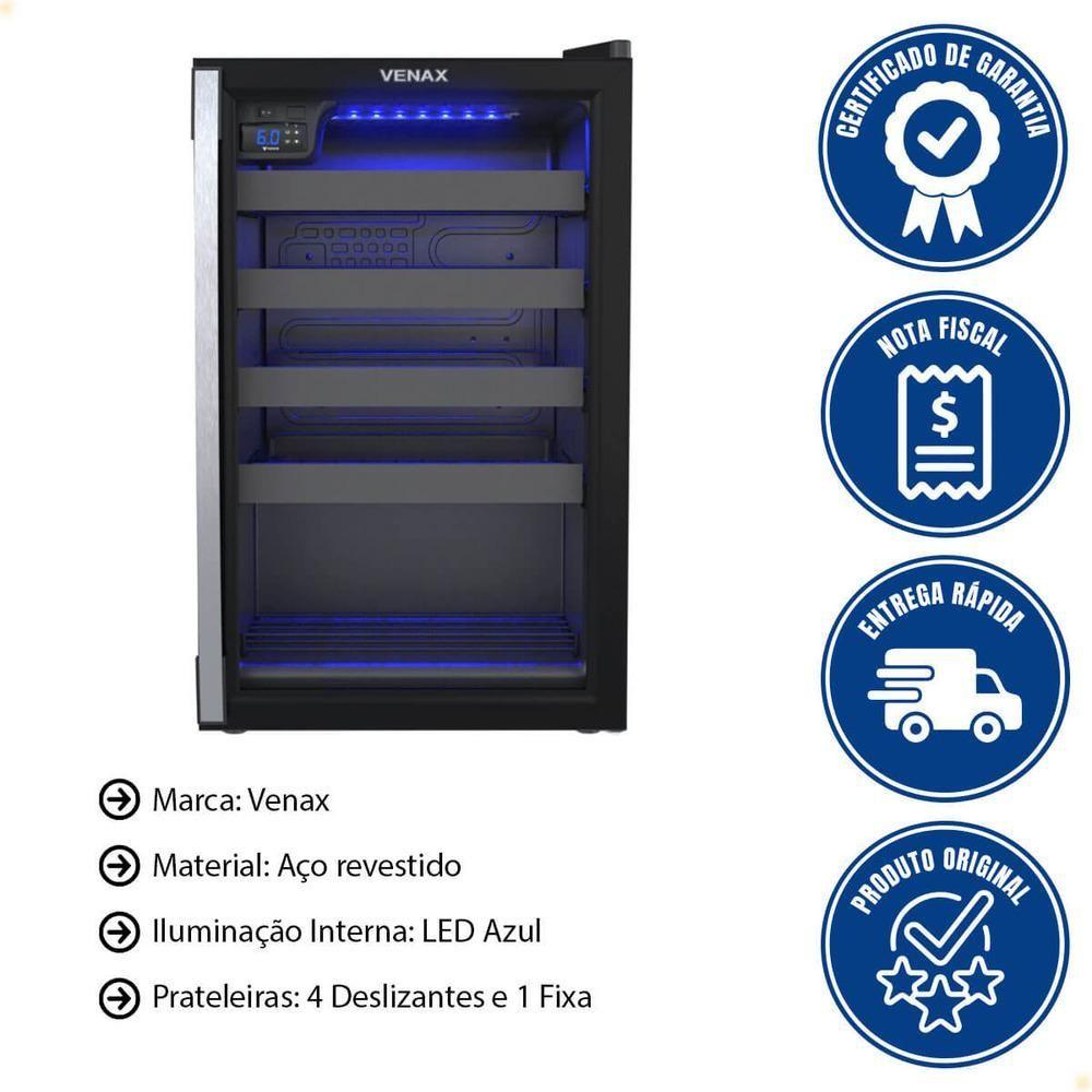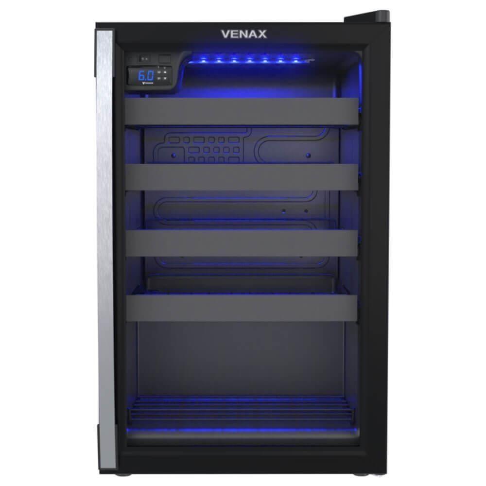 Adega Venax Piubella Cave 100l Preto Fosco 220V 7835- Eleve sua experiência com vinhos ao próximo nível com a Adega Venax Piubella Cave 24 garrafas.- Com 100 litros de capacidade, LED azul que valoriza seus rótulos e 4 prateleiras removíveis, ela oferece organização inteligente e conservação ideal para cada garrafa.- O acabamento preto premium e o design moderno tornam a adega um destaque em qualquer ambiente.- Preserve, aprecie e impressione.- Sua coleção merece o melhor.ADEGA PIUBELLA CAVE 100L PRETO FOSCO 220V 7835Marca: VenaxModelo: Piubella Cave 7835DESCRIÇÃO- Controlador de Temperatura: Digital, Regulável(6°C a 20°C).- Iluminação Interna: LED Azul.- Porta: Vidro Duplo (LOW-E).- Puxador da Porta: Alumínio.- Abertura da Porta: Esquerda para Direita (Olhando de Frente).- Degelo: Natural.- Dreno: Traseiro.- Recipiente de Degelo: Sim.- Prateleiras: 4 Deslizantes e 1 Fixa.- Evaporador: Sem Ar Forçado.- Sistema de Refrigeração: Compressor.- Gás Refrigerante: R134a.- Pés: Frontais Reguláveis e Traseiros com Rolete.- Gabinete Interno: PSAI.- Gabinete Externo: Aço Revestido com Pintura Eletrostática.- Capacidade de Armazenamento: 24 Garrafas / ø Máx.90mm.INFORMAÇÕES- Tensão: 220V.- Frequência: 60Hz.- Isolamento Térmico: Poliuretano.- Etiquetas: Selo de .- Garantia: 1 Ano.- Potência: 150W.- Volume Líquido:82L.PESO- 38 KgDIMENSÕES- Dimensões do produto (Prof. X Larg. X Alt.): 61 x 49.5 x 79 cmPERGUNTAS FREQUENTES:1. Qual a capacidade de armazenamento da adega?A Adega Piubella comporta até 24 garrafas com diâmetro máximo de 90 mm, ideal para coleções médias de vinhos.2. Como funciona o controle de temperatura?O controle é digital e regulável, permitindo ajustar a temperatura entre 6°C e 20°C, garantindo a conservação perfeita de cada tipo de vinho.3. Qual é o tipo de iluminação interna?Possui LED azul, que valoriza os rótulos das garrafas e proporciona um visual moderno e elegante sem interferir na temperatura.4. Que tipo de prateleiras a adega possui?A adega vem com 4 prateleiras deslizantes e 1 fixa, todas removíveis, permitindo organização prática e fácil acesso às garrafas.5. Qual é o sistema de refrigeração e as dimensões do produto?O sistema é com compressor com gás refrigerante R134a, proporcionando resfriamento eficiente sem ar forçado.As dimensões são 61 x 49,5 x 79 cm e o peso é 38 kg. Quantidade de zonas de temperatura: 1 | Potência: 145 W | Linha: Piubella | Cor: Preto Fosco | Sistema de arrefecimento: Compressor | Largura: 49,5 cm | Profundidade: 61 cm | Frequência: 60 hz | Voltagem: 220 v | Temperatura mínima: 6 °C | Temperatura máxima: 20 °C | Com controle de temperatura: Sim | Capacidade em volume: 82 L | Peso: 38 Kg | Quantidade de prateleiras: 5 | Orientação da adega: Vertical | Materiais da porta: Vidro duplo | Com luz interior: Sim | Capacidade de garrafas: 24 | Altura: 79 cm | ProdutoAltura-cm: 79 | ProdutoLargura-cm: 50 | Marca: Venax | Altura Produto: 79 | Cubagem: 0.269620 | Peso Líquido: 34.0000 | Largura Produto: 50 | EmbalagemAltura-cm: 85 | EmbalagemLargura-cm: 61 | Modelo: Não Informado | Dias Fornecedor: 1 | EmbalagemComprimento-cm: 52