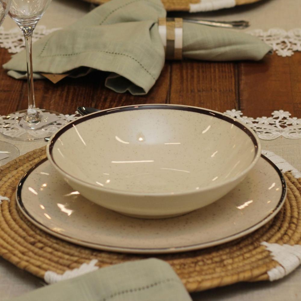 Conjunto 6 Pratos Fundos 20,5cm Brisa Cerâmica OxfordVento no rosto, o som do mar e a areia aos pés, assim é a brisa perfeita de verão. Pensando em trazer essa sensação para dentro de casa, a coleção Brisa recebe a decoração de pequenos detalhes em preto em todo a peça, representando os grãos de areia. As bordas de cada item da coleção recebem a aplicação de um fino filete na cor marrom, remetendo aos materiais naturais como o bambu e a corda. Inspirados na vertente do design biofílico que busca conectar as pessoas com os benefícios trazidos pela presença da natureza em ambientes e na criação de produtos, apresentamos uma coleção com inspiração natural, trazendo seus elementos mais representativos para um dia a dia mais tranquilo.Descrição do produtoMarca: OxfordLinha: BrisaModelo: Prato fundoMaterial: CerâmicaDiâmetro: 20,5cmConteúdo: 6 un do Prato Fundo Convencional 20,5 cm Brisa Cerâmica OxfordResistente a micro-ondasResistente a lava-louçasImagens meramente ilustrativas, todos os itens que ambientam o produto não estão inclusos.