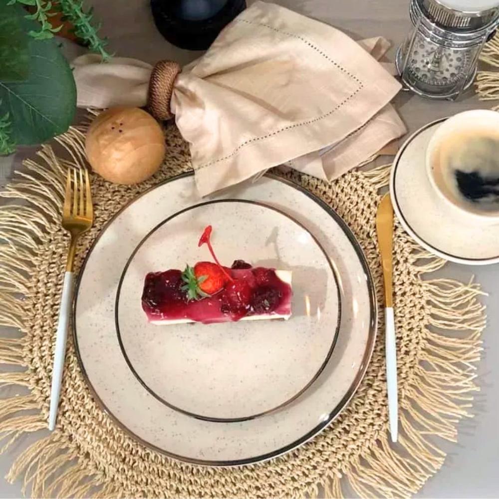 Conjunto 4 Pratos de Sobremesa 18,5cm Brisa Cerâmica OxfordVento no rosto, o som do mar e a areia aos pés, assim é a brisa perfeita de verão. Pensando em trazer essa sensação para dentro de casa, a coleção Brisa recebe a decoração de pequenos detalhes em preto em todo a peça, representando os grãos de areia. As bordas de cada item da coleção recebem a aplicação de um fino filete na cor marrom, remetendo aos materiais naturais como o bambu e a corda. Inspirados na vertente do design biofílico que busca conectar as pessoas com os benefícios trazidos pela presença da natureza em ambientes e na criação de produtos, apresentamos uma coleção com inspiração natural, trazendo seus elementos mais representativos para um dia a dia mais tranquilo.Descrição do produtoMarca: OxfordLinha: BrisaModelo: Prato de sobremesaMaterial: CerâmicaDiâmetro: 18,5cmConteúdo: 4 un do prato de sobremesa 18,5cm Brisa Cerâmica OxfordResistente a micro-ondasResistente a lava-louças Imagens meramente ilustrativas, todos os itens que ambientam o produto não estão inclusos.
