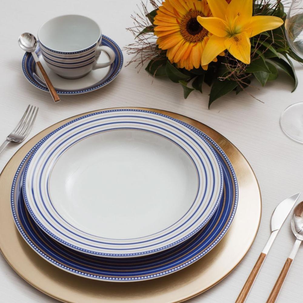 Jogo de Jantar 84 Peças Chá Café Paula Porcelana Schmidt O contraste entre o azul e o marrom nesta composição aliam o céu e a terra em uma linda peça. Em formato mais arredondado esse aparelho será a estrala de sua mesa posta e é facilmente combiando com outras peças e decorações. Colorido, mas ao mesmo tempo neutro, uma elegante composição que sua cozinha merece.O jogo de jantar 84 peças possui: 12 Pratos Rasos 27 cm, 12 Pratos Fundos 23 cm, 12 Pratos de Sobremesa 19 cm, 12 Xícaras de Chá 200 ml, 12 Pires de Chá 14,5 cm, 12 Xícaras de Café 70 ml e 12 Pires de Café 11,3 cm. Descrição do produtoMarca: Porcelana SchmidtColeção: PaulaTipo de produto: Serviço de Jantar completoQuantidade de peças: 84Conteúdo:12x Pratos Rasos 27 cm12x Pratos Fundos 23 cm12x Pratos de Sobremesa 19 cm12x Xícaras de Chá 200 ml12x Pires de Chá 14,5 cm12x Xícaras de Café 70 ml12x Pires de Café 11,3 cm Imagens meramente ilustrativas, todos os itens que ambientam o produto não estão inclusos.