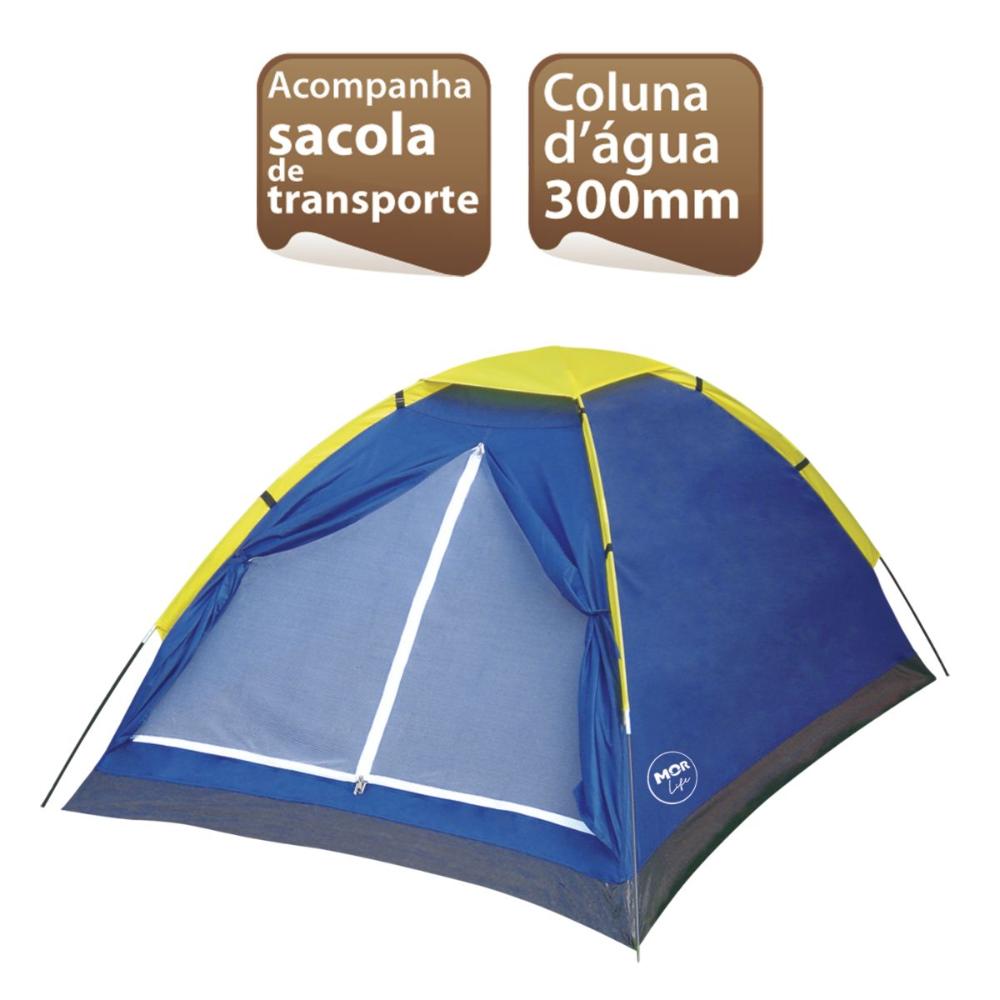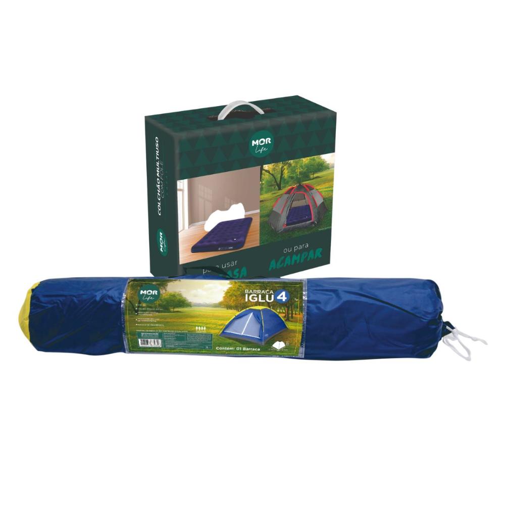 Barraca Iglu 4 Pessoas Camping Acampamento Colchão Casal MorPraticidade, conforto e segurança para os seus momentos de lazer! A Barraca Iglu da Mor é ideal para quem gosta de acampar com praticidade. Super fácil de montar, possui estrutura em varetas de fibra de vidro interligadas, garantindo resistência e estabilidade. Produzida em poliéster de alta qualidade, conta com costura invertida que evita a entrada de água e piso em polietileno (ráfia) reforçado para maior durabilidade. Para mais conforto, a barraca traz mosquiteiro na porta e no teto, bolso interno para pendurar lanterna e acompanha sacola de nylon que facilita o transporte. Já o Colchão Multiuso Casal Mor é feito em PVC resistente, possui superfície aveludada e ondulações que garantem conforto, além de inflador acoplado, válvula de enchimento seguro, kit de reparo e embalagem compacta com alça. Mede 1,91m x 1,37m x 22cm e suporta até 160 kg.Descrição:Barraca Iglu 4 Pessoas MorConteúdo da Embalagem: 1 Barraca, 1 Sacola de Transporte + Manual de Instruções.Coluna D´Água 300mm.Estrutura: Varetas de fibra de vidro interligadas.Material: Confeccionada em poliéster e piso em polietileno (ráfia) .Costura invertida entre o piso e o dormitório, evitando vazamentos.Mosquiteiro na porta e no teto.Bolso interno para pendurar lanterna.Medidas: 1,30m x 2,10m x 2,10m.Capacidade: 4 pessoas.ATENÇÃO: A barraca não protege 100% da chuva.Colchão Multiuso Casal MorConteúdo da Embalagem: 1 Colchão Inflável Casal + Manual de Instruções.Produzido em PVC resistente com superfície aveludada.Ondulações anatômicas para maior conforto.Inflador acoplado com sistema de fole.Válvula de enchimento seguro e rápido esvaziamento.Compacto, com embalagem prática e kit de reparo.Medidas: 1,91m x 1,37m x 22cm.Capacidade: até 160 kg.Imagens meramente ilustrativas, todos os itens que ambientam o produto não estão inclusos.