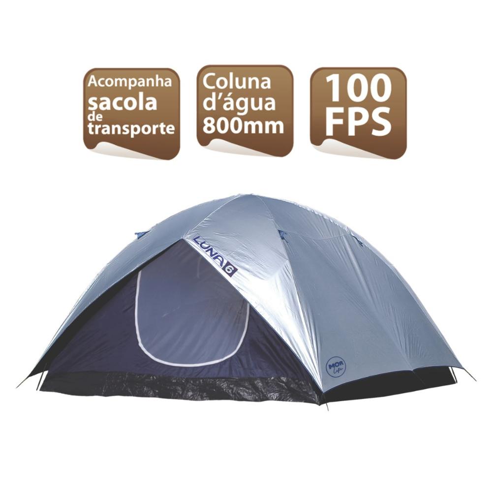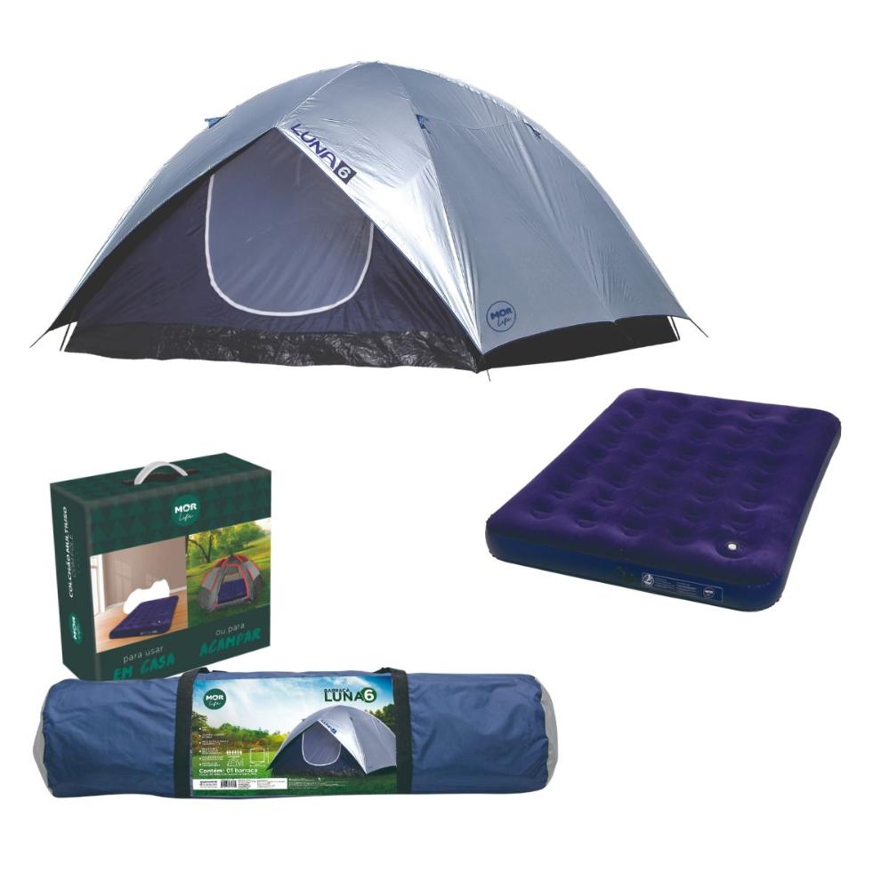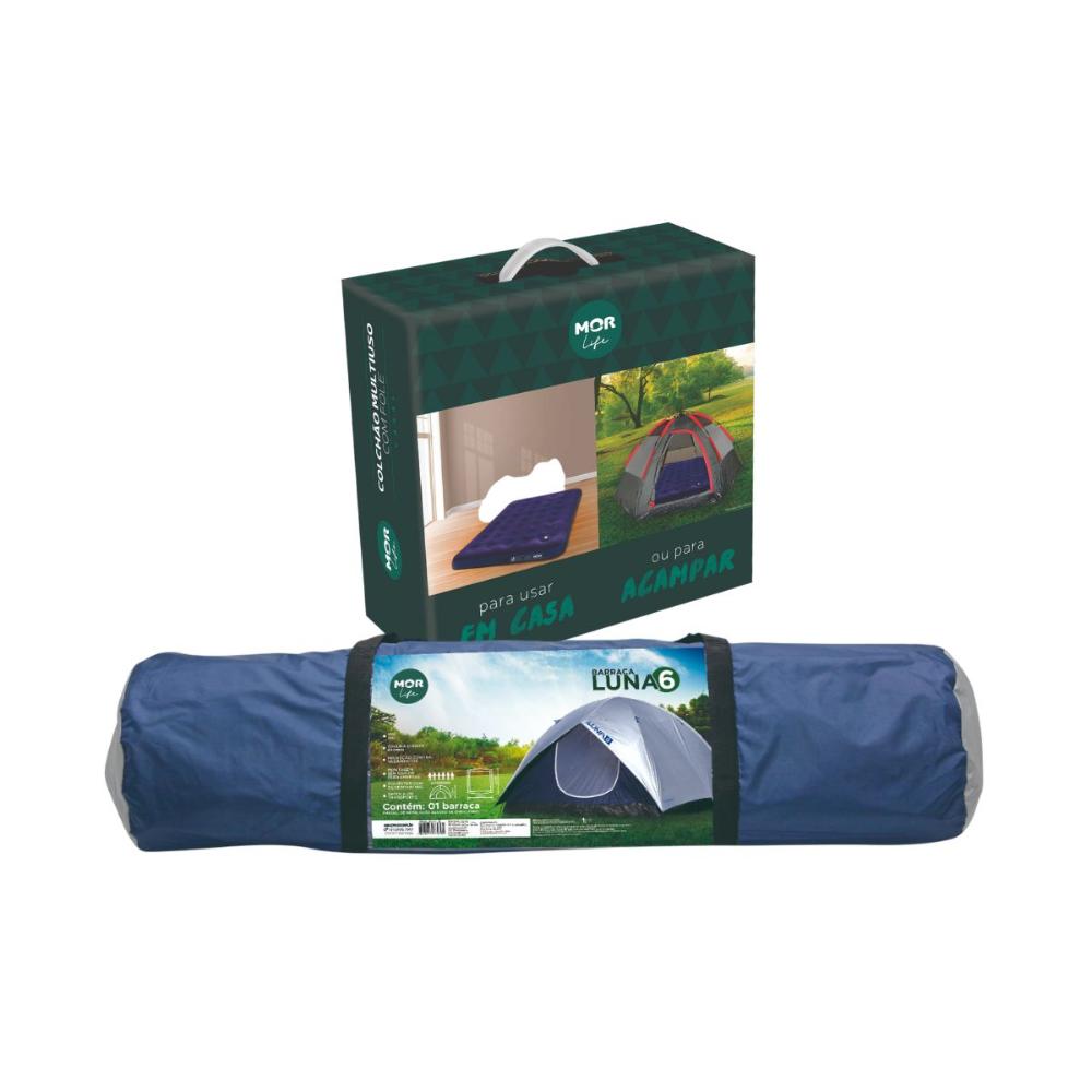 Barraca Iglu Luna 6 Pessoas Acampamento Colchão Casal MorConforto, modernidade e segurança para suas aventuras! A Barraca Luna da Mor possui sobreteto até o chão revestido em silvercoating, que reflete a luz solar e reduz o calor interno, FPS 100, além de mosquiteiros na porta, teto e janela traseira. Internamente, traz local para pendurar lanterna, garantindo praticidade no acampamento. Já o Colchão Multiuso Casal Mor é feito em PVC resistente, possui superfície aveludada e ondulações que garantem conforto, além de inflador acoplado, válvula de enchimento seguro, kit de reparo e embalagem compacta com alça. Mede 1,91m x 1,37m x 22cm e suporta até 160 kg.Descrição:Barraca Iglu Luna 6 Pessoas MorConteúdo da Embalagem: 1 Barraca, 1 Sacola de Transporte + Manual de Instruções.Coluna D´Água 800mm.FPS 100.Estrutura: Varetas de fibra de vidro interligadas.Material: Confeccionada em poliéster e piso em polietileno (ráfia) reforçado, com sobreteto até o chão e revestimento silvercoating.Costura invertida evitando vazamentos.Mosquiteiros na porta, teto e janela traseira.Local interno para pendurar lanterna.Telas internas em nylon respirável para melhor circulação de ar.Medidas: 2,60m (C) x 2,60m (L) x 1,65m (A).Capacidade: 6 pessoas.ATENÇÃO: A barraca não protege 100% da chuva.Colchão Multiuso Casal MorConteúdo da Embalagem: 1 Colchão Inflável Casal + Manual de Instruções.Produzido em PVC resistente com superfície aveludada.Ondulações anatômicas para maior conforto.Inflador acoplado com sistema de fole.Válvula de enchimento seguro e rápido esvaziamento.Compacto, com embalagem prática e kit de reparo.Medidas: 1,91m x 1,37m x 22cm.Capacidade: até 160 kg.Imagens meramente ilustrativas, todos os itens que ambientam o produto não estão inclusos.