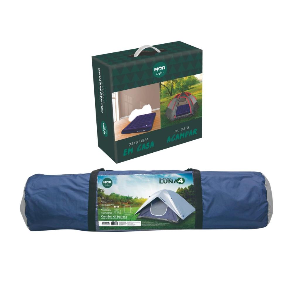 Barraca Luna 4 Pessoas Acampamento Colchão Casal MorConforto, segurança e praticidade para suas aventuras! A Barraca Luna da Mor possui sobreteto até o chão revestido em silvercoating, que reflete a luz solar e reduz o calor interno, FPS 100, além de mosquiteiros na porta, teto e janela traseira. Internamente, traz local para pendurar lanterna, garantindo mais funcionalidade no acampamento. Já o Colchão Multiuso Casal Mor é feito em PVC resistente, possui superfície aveludada e ondulações que garantem conforto, além de inflador acoplado, válvula de enchimento seguro, kit de reparo e embalagem compacta com alça. Mede 1,91m x 1,37m x 22cm e suporta até 160 kg.Descrição:Barraca Luna 4 Pessoas MorConteúdo da Embalagem: 1 Barraca, 1 Sacola de Transporte + Manual de Instruções.Coluna D´Água 800mm.FPS 100.Estrutura: Varetas de fibra de vidro interligadas.Material: Confeccionada em poliéster e piso em polietileno (ráfia) reforçado, com sobreteto até o chão e revestimento silvercoating.Costura invertida evitando vazamentos.Mosquiteiros na porta, teto e janela traseira.Local interno para pendurar lanterna.Telas internas em nylon respirável para melhor circulação de ar.Medidas: 2,10m (C) x 2,10m (L) x 1,30m (A).Capacidade: 4 pessoas.ATENÇÃO: A barraca não protege 100% da chuva.Colchão Multiuso Casal MorConteúdo da Embalagem: 1 Colchão Inflável Casal + Manual de Instruções.Produzido em PVC resistente com superfície aveludada.Ondulações anatômicas para maior conforto.Inflador acoplado com sistema de fole.Válvula de enchimento seguro e rápido esvaziamento.Compacto, com embalagem prática e kit de reparo.Medidas: 1,91m x 1,37m x 22cm.Capacidade: até 160 kg.Imagens meramente ilustrativas, todos os itens que ambientam o produto não estão inclusos.