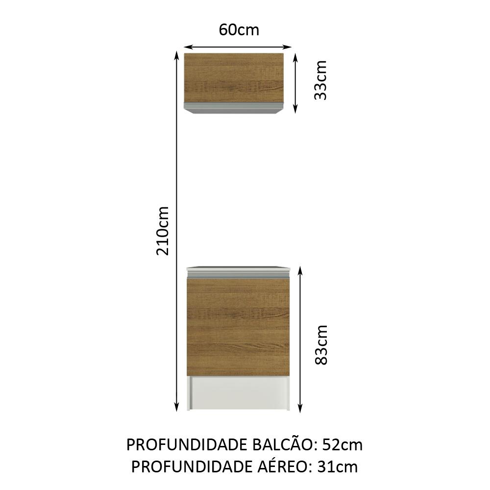 O Kit de 60 cm com Balcão e Armário Aéreo da linha Topazio da Madesa é a opção na medida para uma área de serviço compacta e que necessita de total aproveitamento de espaço.O balcão possui uma porta com dobradiças metálicas e acompanha tampo. Já o aéreo contempla uma porta basculante, com abertura com pistão a gás.O acabamento da estrutura é branco e as portas são no padrão amadeirado Rustic. O processo é feito em Pintura Poliéster ecológica com 7 camadas, detalhe que confere mais durabilidade e qualidade aos produtos.(Imagens meramente ilustrativas: os eletros e as decorações não acompanham o produto.)Itens inclusos:- Um (1) Balcão de 83 cm de altura, 60 cm de largura e 52 cm de profundidade com tampo e uma (1) porta.- Um (1) Aéreo de 33 cm de altura, 60 cm de largura e 31 cm de profundidade com porta basculanteCódigo do produto: XAGRTP0600019BObs.: A Madesa não disponibiliza serviço de montagem. O produto segue com manual de instalação e todas as ferragens necessárias para sua montagem.1-O produto é novo ou usado?R.: Todos os produtos da Madesa são novos, enviados da nossa fábrica diretamente para as casas de nossos clientes.2-O produto vem montado? Se não, vocês realizam a montagem?R.: A Madesa não disponibiliza serviço de montagem. Todos os produtos seguem com manual de instalação e as ferragens necessárias. Alguns produtos possuem vídeo explicando o passo a passo da montagem.3-Vocês possuem loja física? Posso retirar meu produto em mãos?R.: Não possuímos loja física, apenas loja virtual. Confira as opções de envio ao colocar o seu CEP.4-Qual é o valor do envio? Posso pagar separadamente?R.: O valor do envio é calculado com base no peso e volume do produto, e no CEP de destino. Você pode calcular o valor e prazo de entrega no simulador.5-A Madesa entrega em todo Brasil? Como é feita a entrega?R.: Sim, entregamos no Brasil inteiro através de transportadoras parceiras.6-O produto acompanha Nota Fiscal?R.: Sim, todos os produtos são entregues com suas respectivas notas fiscais.7-Os produtos possuem garantia?R.: Sim. A Madesa oferece 3 meses de garantia para defeitos de fabricação.A Madesa se dedica à sustentabilidade com várias iniciativas: temos uma usina própria para gerar energia que abastece uma de nossas fábricas. Selecionamos nossos fornecedores, priorizando aqueles que possuem um compromisso com a sustentabilidade e proteção do meio ambiente. Todo o plástico utilizado no setor produtivo é proveniente de reciclagem e as suas sobras são encaminhadas ao fornecedor que os recicla. Também investimos no desenvolvimento contínuo de nossos colaboradores e em ações educacionais que beneficiem a comunidade.