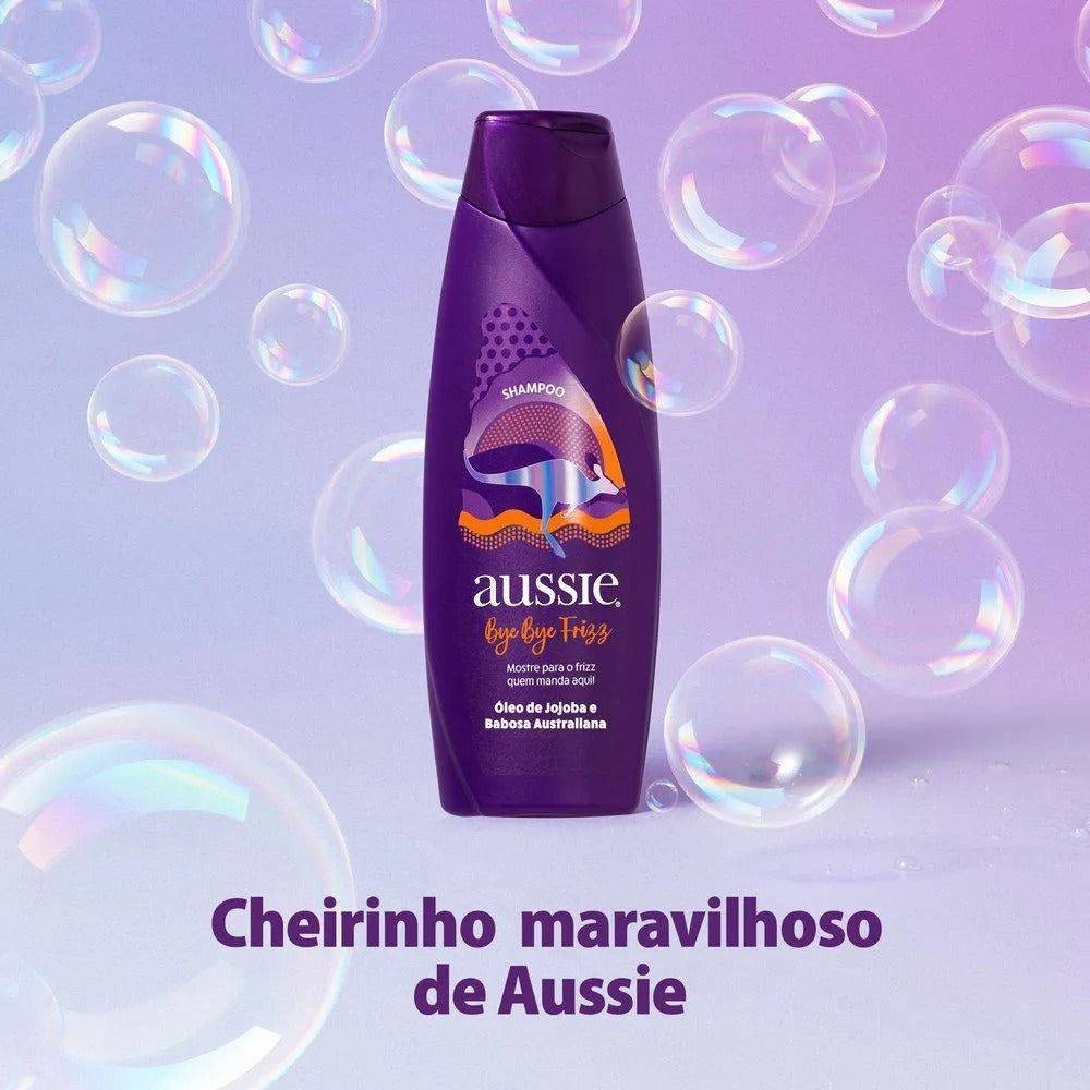 Para Que Serve:O kit Aussie Bye Bye Frizz dá uma aula de disciplina nos seus fios mais rebeldes, transformando o frizz em um cabelo cheio de brilho e maciez. Ele ainda deixa o cabelo com aquele cheirinho de Aussie que todo mundo ama. - Mostre para o frizz quem manda aqui! Cabelo hidratado e sem frizz, para você não parar de curtir - Fórmula dos Estados Unidos e inspirada na Austrália - Com Babosa Australiana e Óleo de Jojoba - 100% livre de parabenos, petrolatos e corantes - Vegano e Cruelty Free Dicas para um efeito maravilhaussie: 1. Lave bem o seu cabelo com o Shampoo Aussie Bye Bye Frizz. Repita até que sinta seu cabelo totalmente limpo. 2. Tire o excesso de água do cabelo. Se precisar, use uma toalha macia e seca. 3. Aplique o 3 Minutos Milagrosos Aussie Bye Bye Frizz, deixe agir por 3 minutos e enxágue. 4. Aplique o Condicionador Aussie Bye Bye Frizz para selar as cutículas e enxágue. 5. Aplique o Spray Leave-In Aussie Bye Bye Frizz e curta o cabelo mais macio e brilhoso.• Óleo de Jojoba e Babosa Australiana• Super hidratação que não pesa• 100% livre de parabenos, petrolatos e corantes• Brilho e maciez• Shampoo e 3 Minutos Milagrosos veganos e sem crueldade animal