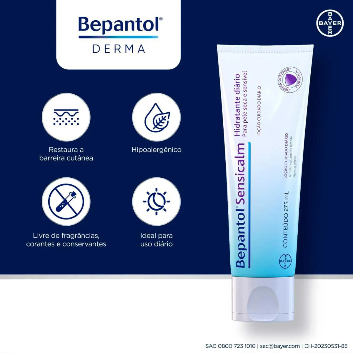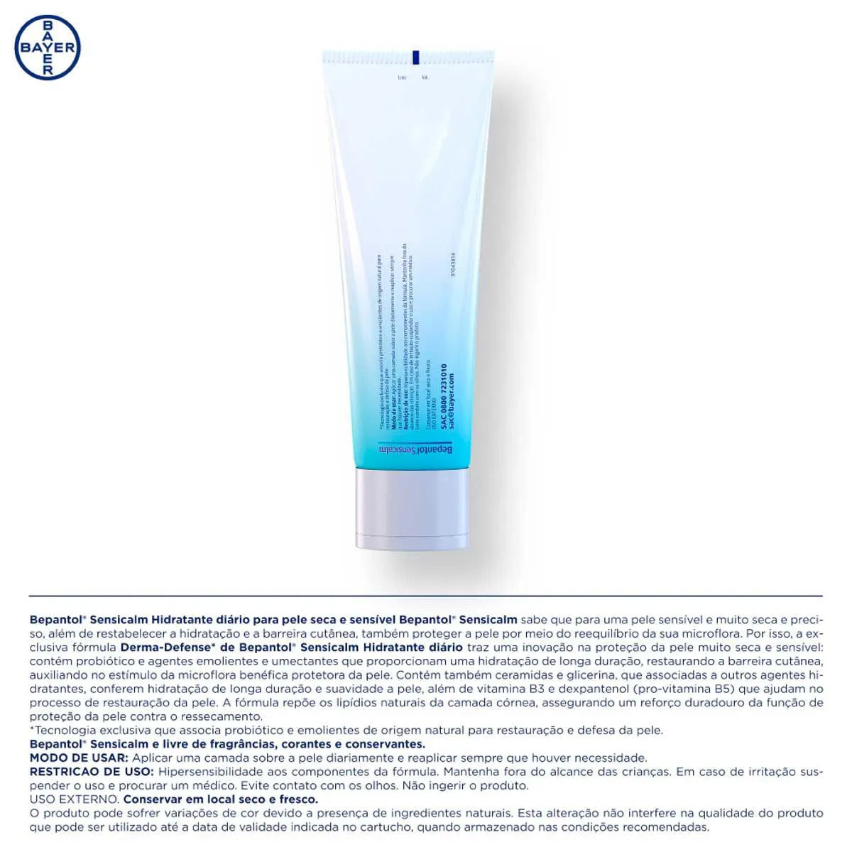 Para Que Serve:Bepantol® Sensicalm foi desenvolvido especialmente para o cuidado da pele muito seca, sensível e reativa, pois é hipoalergênico (livre de fragrâncias, corantes e conservantes). Possui a tecnologia Derma Defense, com bioprotetor ( prebiótico) que estimula os microrganismos benéficos da pele e ingredientes hidratantes de origem natural para defesa e restauração da barreira cutânea.Modo de Usar:Aplicar uma camada sobre a pele diariamente e reaplicar sempre que houver necessidade.