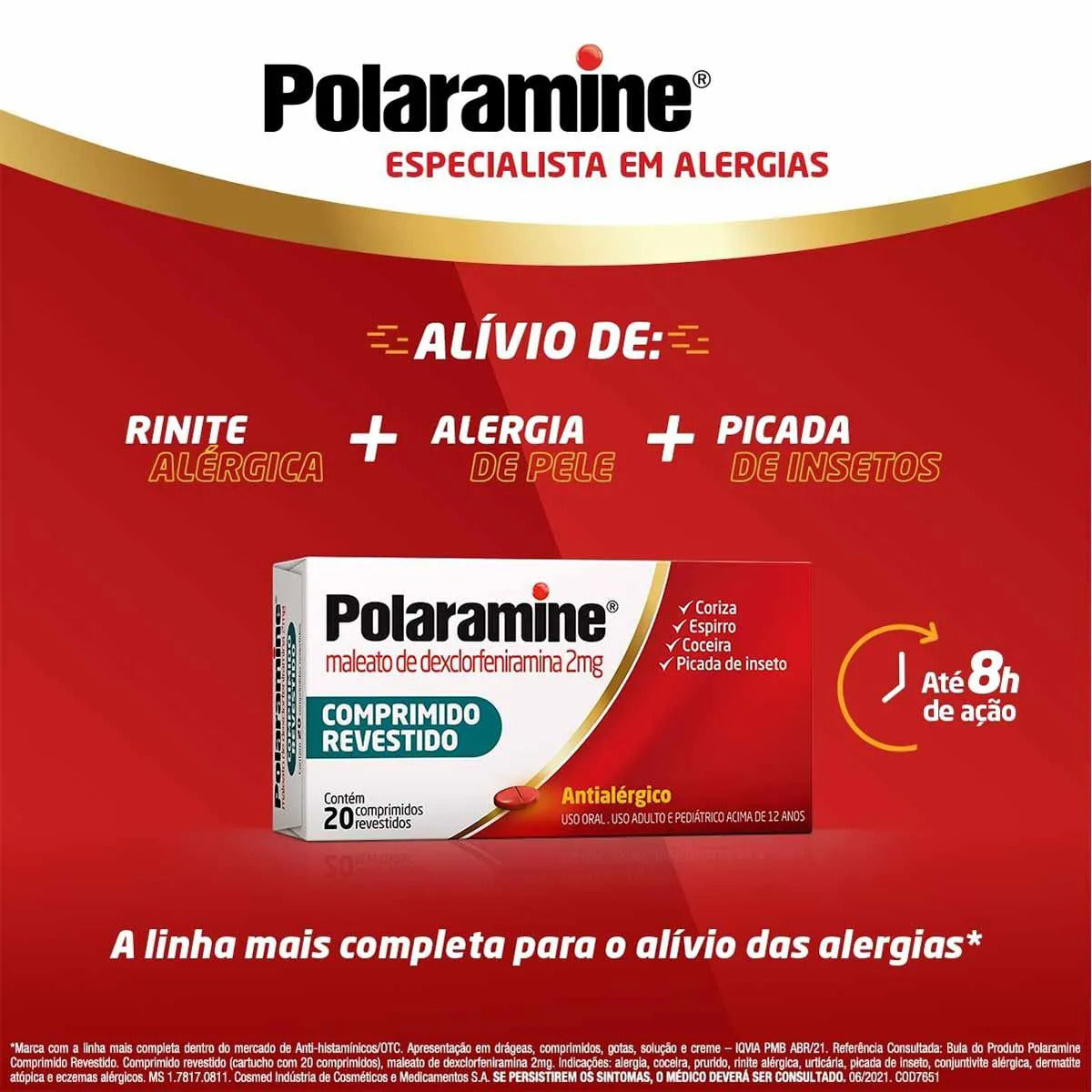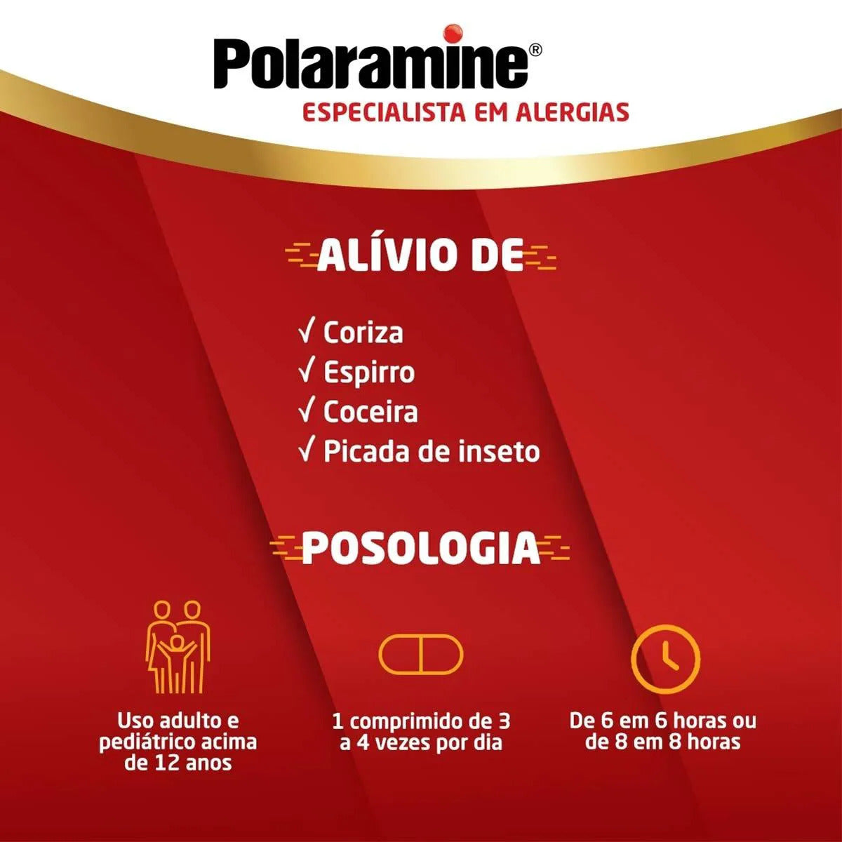 Indicação:Polaramine é destinado para alergia, prurido, rinite alérgica, urticária, picada de inseto, conjuntivite alérgica, dermatite atópica (um tipo de inflamação na pele) e eczemas alérgicos (dermatite). Posologia:Adultos e crianças maiores de 12 anos: 1 comprimido 3 a 4 vezes por dia. Não ultrapassar a dose máxima de 12mg/dia (ou seja, 6 comprimidos/dia). Siga corretamente o modo de usar. Em caso de dúvidas sobre este medicamento, procure orientação do farmacêutico. Não desaparecendo os sintomas, procure orientação de seu médico ou cirurgião-dentista. Este medicamento não deve ser partido, aberto ou mastigado. Quando não devo usar este medicamento:Este medicamento é contraindicado em pacientes com hipersensibilidade aos componentes da fórmula ou a outros anti-histamínicos de estrutura química similar. Polaramine, como os demais anti-histamínicos, não deve ser usado em prematuros ou recém-nascidos e em pacientes que estão fazendo uso de inibidores da monoaminoxidase (IMAOs). Este medicamento é contraindicado para menores de 12 anos. SE PERSISTIREM OS SINTOMAS, O MÉDICO DEVERÁ SER CONSULTADO. POLARAMINE É UM MEDICAMENTO. DURANTE SEU USO, NÃO DIRIJA VEÍCULOS OU OPERE MÁQUINAS, POIS SUA AGILIDADE E ATENÇÃO PODEM ESTAR PREJUDICADAS.