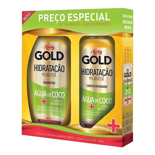 Para Que Serve:O Kit Niely Gold Hidratação Milagrosa Água de Coco é composto por 1 shampoo e 1 condicionador que promovem limpeza e hidratação profunda sem agredir os fios.Modo de Usar:Shampoo Aplique uma pequena quantidade do shampoo sobre os cabelos molhados. Massageie delicadamente e, em seguida, enxágue bem. Caso necessário, repita o processo. Condicionador Após lavar os cabelos, aplique o produto ao longo dos fios, evitando a raiz, e deixe agir por 3 minutos. Após, enxágue.