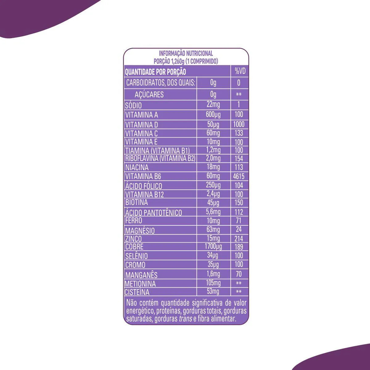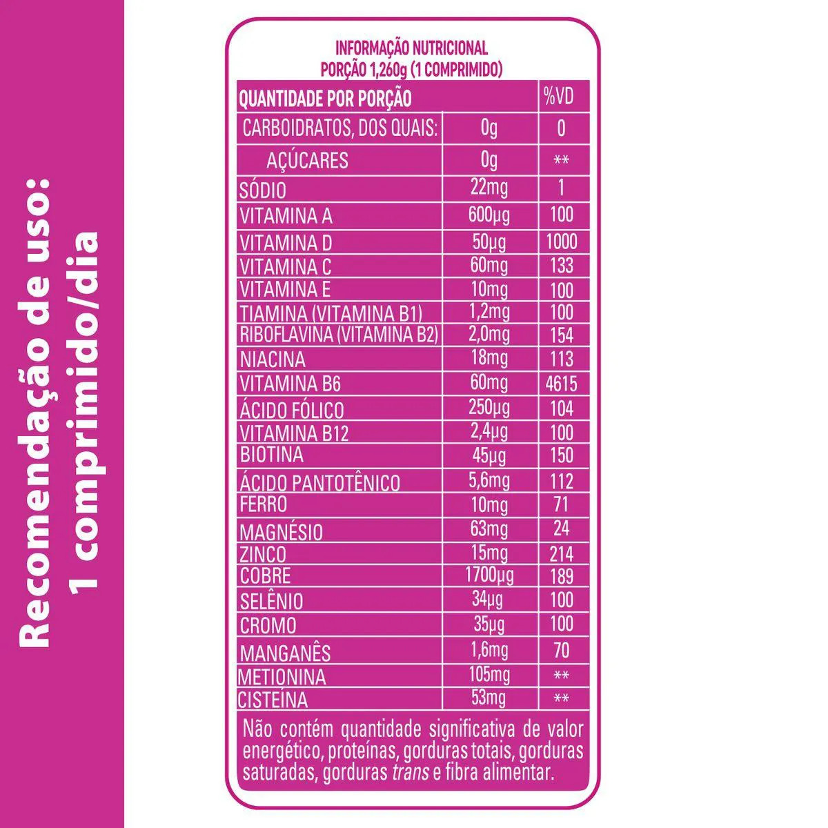 O que é Suplemento vitamínico diário, contendo a dose ideal de Vitamina D mais um complexo de outras vitaminas e minerais. Para que serve Auxilia na manutenção de cabelos, pele e unhas, formação de colágeno e antioxidante. Modo de usar 1 comprimido ao dia.